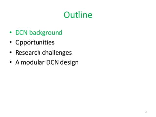 The document discusses the current state and future opportunities in data center networks (DCN), outlining challenges related to scalability, performance, and fault tolerance. It emphasizes the need for innovative designs and protocols to enhance network efficiency, given the growing demands of cloud computing and the inherent limitations of bandwidth. A modular DCN design is proposed as a potential solution to these challenges, along with a focus on the importance of research in this area.