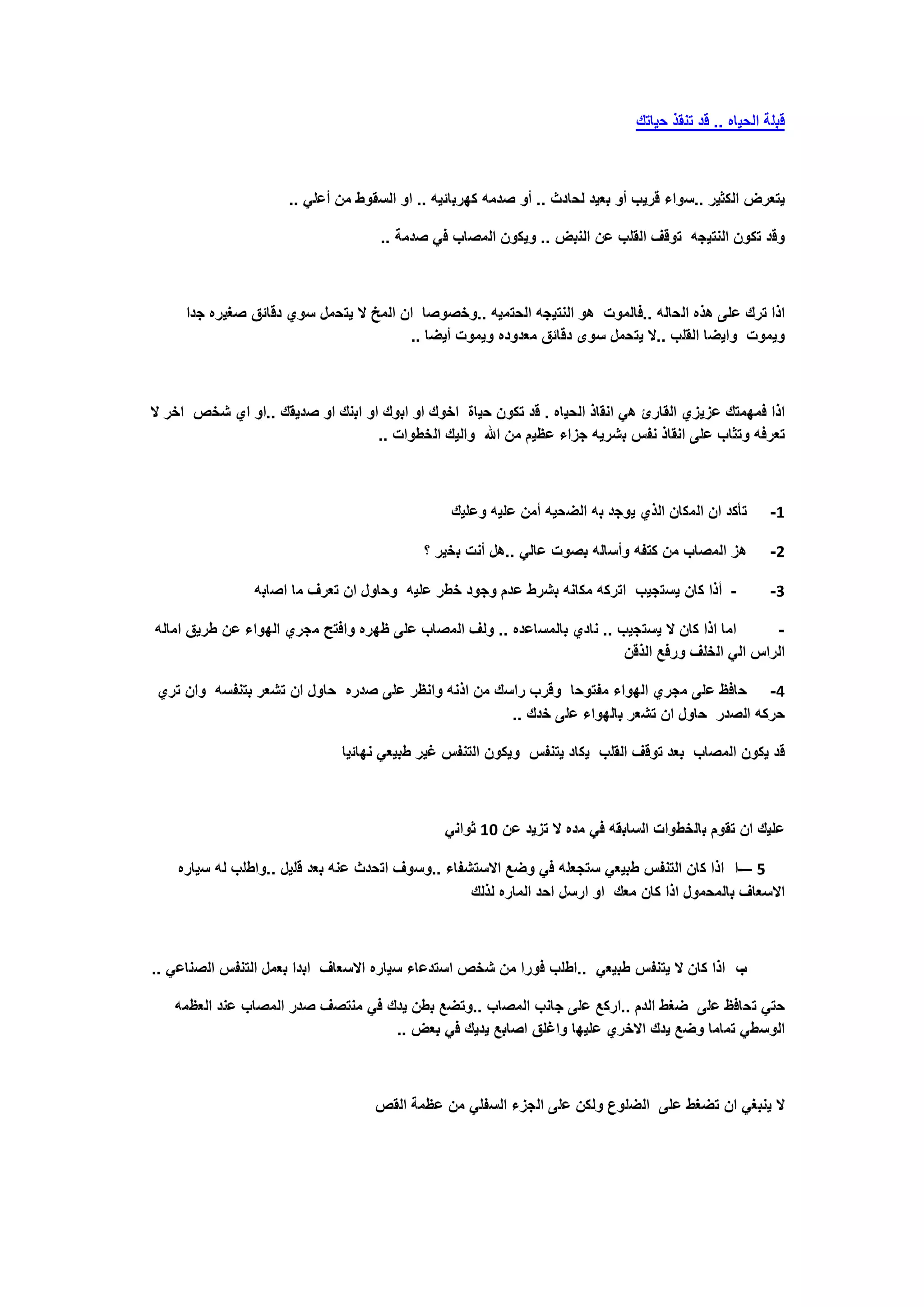 تستعرض الوثيقة إجراءات إنقاذ الحياة عند حالات الطوارئ مثل توقف القلب أو الصدمات. تتضمن الخطوات الضرورية التحقق من استجابة المصاب وتطبيق تقنية التنفس الصناعي والضغط على الصدر بشكل صحيح. تعتبر معرفة هذه الإجراءات أساسية لكل شخص بهدف إنقاذ حياة الآخرين.