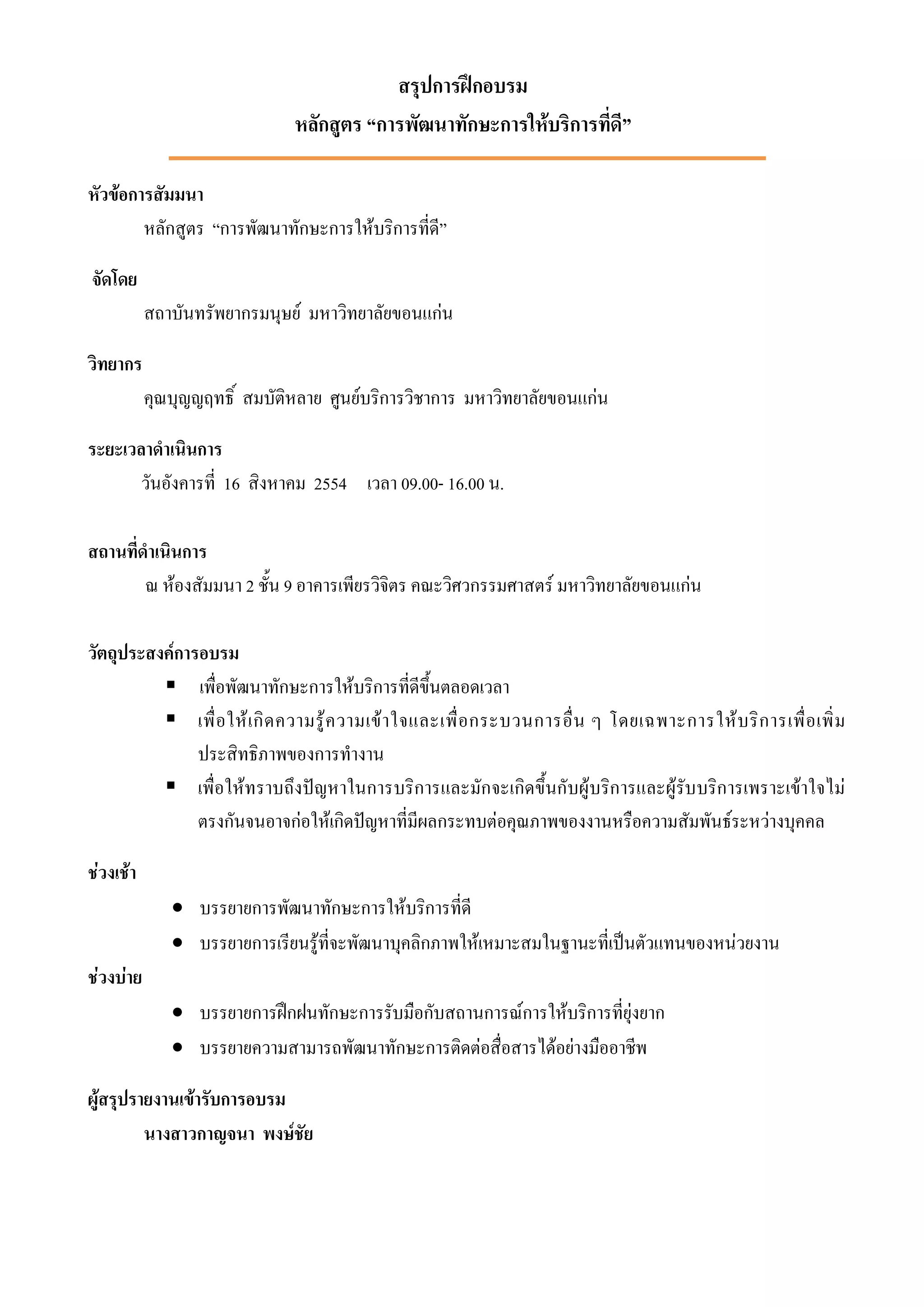 สรุปการอบรมหลักสูตรการพัฒนาทักษะการให้บริการที่ดี