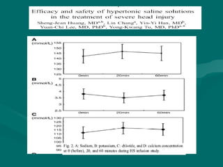 副作用 --- 全身高钠血症 充血性心力衰竭 低钾血症、高氯性酸中毒、 凝血功能失调 急性肾功能衰竭 Suarez Jl : Editorial comment : Salting the brain to improve CBF in SAH patients . Stroke , 2003 , 34 : 1396 . Vivo P . Hypertonic saline solution : a safe alternative to mannitol 18 % in neurosurgery . Minerva—Anesthosiol , 200l,67 : 603 Suarez JI . Treatment of refractory intracranial hypertension with 23.4 % saline . Crit Care Med , 1998 , 26 : Ill8 .