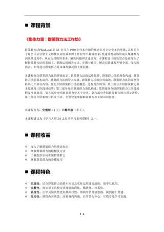 《集体力量:群策群力法工作坊》课程旨在提高群体决策质量和集体创造力,介绍群策群力法的基础知识、运作原理和应用技巧。课程内容包括角色构成、导入实施和案例分析,适合中高层管理人员和人力资源相关人员。参与者将通过实战演练掌握群策群力的理论与实践,推动组织变革和流程改进。