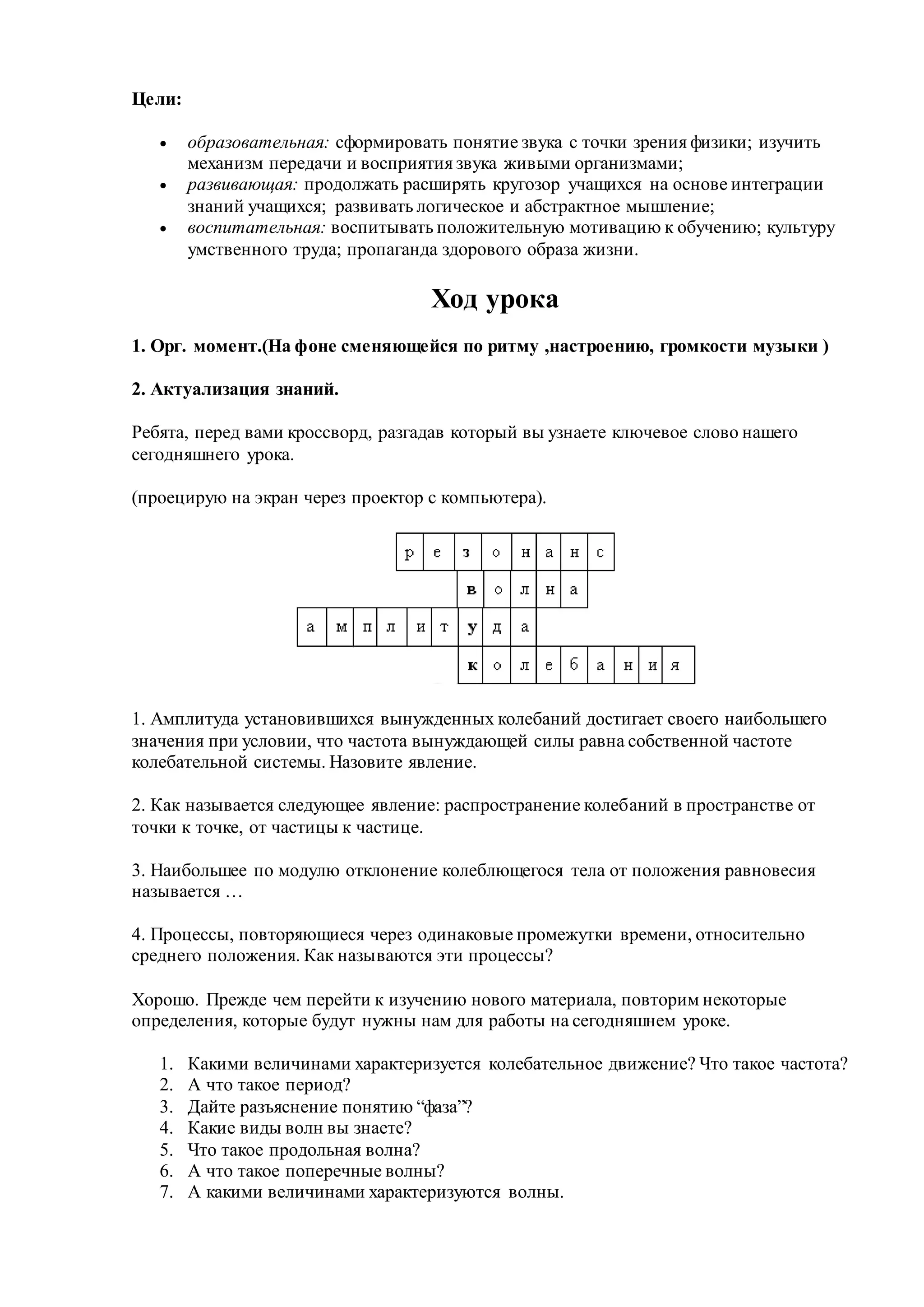 Документ описывает цели урока по физике, посвященного звучанию и звуковым колебаниям, включая механизмы передачи звука и восприятия его живыми организмами. Урок включает актуализацию знаний, разгадывание кроссворда и объяснение таких понятий, как звук, его источники и свойства. Также рассматриваются методы восприятия звуков различными организмами и влияние шума на здоровье человека.