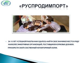 Документ описывает структуру и деятельность группы компаний 'Руспродимпорт', включая информацию о склады, отделы, продукцию и регионы продаж. Компания предлагает широкий ассортимент аминокислот и технологических продуктов, а также активно занимается научными исследованиями для развития кормопроизводства. Цель компании - внедрение новых технологий и построение долгосрочных отношений с клиентами и партнерами.