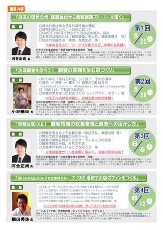 製薬会社 名古屋 ITベンチャ 4社を経験。中堅IT企業 管理本部副部長を経 独立 そ 中 いくつ 倒産や合併を経験し 業務改善 ンタ ネッ 通 サ 立 上 運用 決算業務 資金繰 人事 採用 各種銀行交渉 管理会計 制 会計 売 売管理 マ ン 様々 業務を経験す 〇経営計画 例え 飛行機 運転 ○経営計画 ベ 目的 応 ○SWOT 分析等 見え 自店 強み、弱み ○本質的 強み 顧客価 、希少性、模 困難性 等 ○自店 活躍 〝領域〟を考え 等 ※事例を 、ワ 計画 、文章化を体験! 自店 現状分析 課題抽出 戦略展開スト リ を描く 江戸小紋空間 ザ ン代表 空間コ ネ タ 大学 業後 事務職 傍 和雑 ネッ ショップ経営を行い 2006 年 和雑 個展 売を開催し好評を 博す そ 後日本 食 空間や室内空間 つい 学び ン コ ネ タ 事務所 注文住宅 ウスメ 等 色彩心理学や日本 食 住 知識を駆使し 棟以上 注文住宅 店舗 内装コ ネ や コ ネ ションを担当 6年空間コ ネ タ し 独立 現在 個人宅 ン コ ネ 提 案 他 集客 店舗を目指す企業や ナ 向 空間プロ ュ スを行う 〇いわゆ 売 店 何? そ 5 条件 ○来店 ⇒ 滞在 ⇒ 購入 ⇒ 再来店 仕組作 入店率をあ 3 イン 、滞在時間を伸 仕組み、購入 た 仕掛 等 ○ 5W H 見直 店 ○視覚効果を使 た 店 イアウ 、カラ 等 ※モ 店舗を例題 、店舗改善 仮想体験! 生涯顧客を作 う! 顧客 笑顔を生む店 く 河合中小企業診断士 社会保険労務士事務所 代表 会計事務所 製薬会社 名古屋 ITベンチャ 4社を経験。中堅IT企業 管理本部副部長を経 独立 そ 中 いくつ 倒産や合併を経験し 業務改善 ンタ ネッ 通 サ 立 上 運用 決算業務 資金繰 人事 採用 各種銀行交渉 管理会計 制 会計 売 売管理 マ ン 様々 業務を経験す 〇商圏を考え 上 必要 事 商品特性、業態分類 等 ○無料 使え 商圏 分析 ○顧客 情報を得 方法 プ 活用 ○顧客情報 分類、分析 手法 ○ 客様 求 い を知 う 等 ※情報管理 を実際 用い 、改善 研究指 ! 情報 宝 山! 顧客情報 収集管理 商売へ 活 し方 ン パ ㈱ 代表取締役 ネッ ビ ネ ナリ 昭和46年生ま 広島県出身 広島大学 理学部 数学科 業 財 い 産業創造機構 専門家登録 ウ Pro le Ya oo!知恵袋 教え oo! ITコンサ タン や M新潟 番組審議委員 し 日々活躍中 4年 公立長岡造形大学 情報 シ 論 講師 務 〇LINE ユ 68 万 ホ 販促 無料 LINE@活用 ○ ビを見 い ホ世代 若者 ハ You ube 販促手法 ○ ホGP 機能を使 た位置情報 ビ 来店 与え 影響 ○大衆化 た ホ投稿 口コ を利用 た Twitter ビ ネ 活用 ○ ホ 簡 写真を撮 Instagram 投稿 分 購買行動 等 ※ ホ等 具体的 導入体験! 帰 活用 ! 良いも も伝わ なけ 意味 ない I N 活用 店 ファンを く