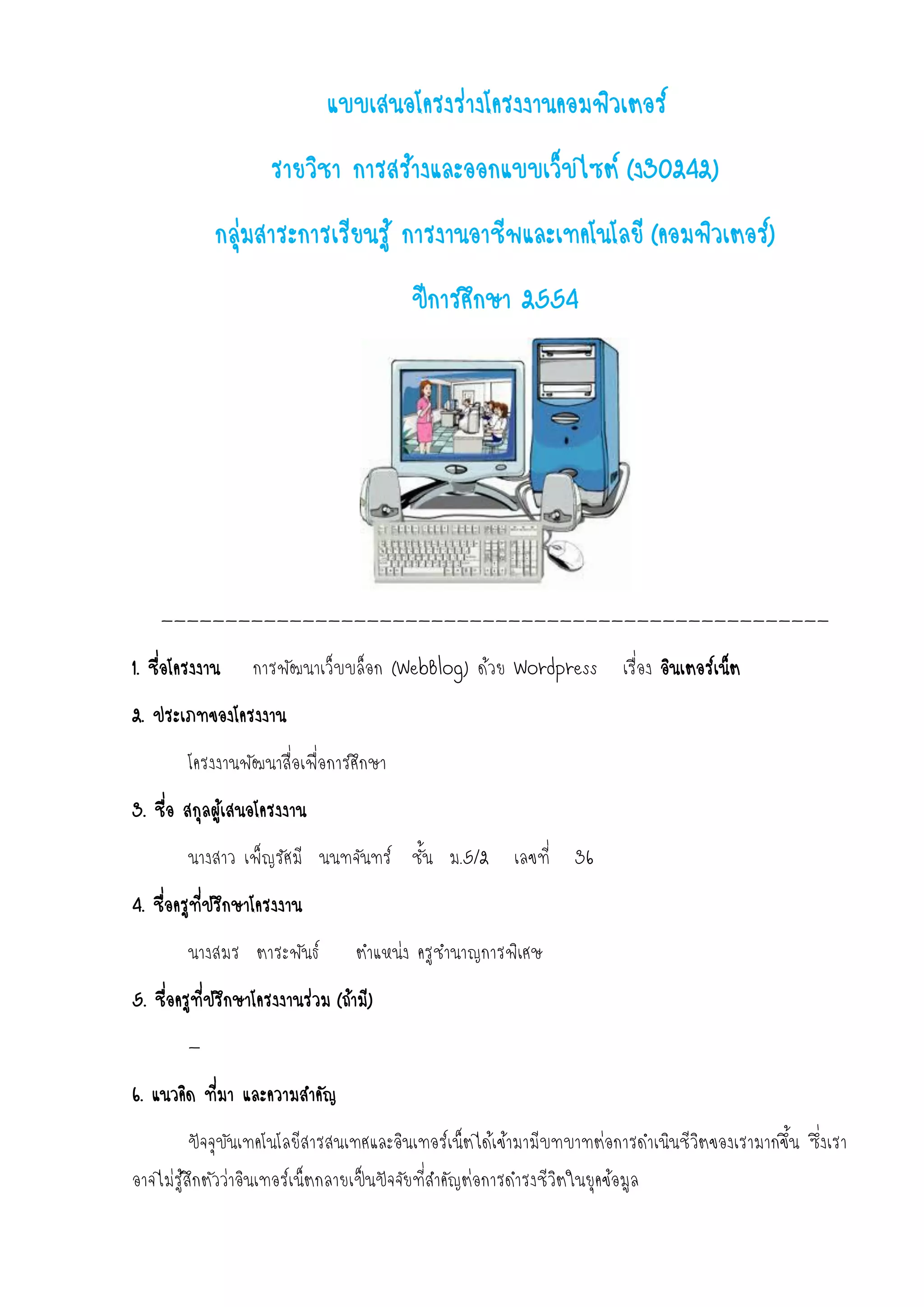 รายวิชา การสร้างและออกแบบเว็บไซต์ (ง30242) กลุ่มสาระการเรียนรู้ การงานอาชีพและเทคโนโลยี (คอมพิวเตอร์) ปีการศึกษา 2554 ---------------------------------------------------- 1. ชื่อโครงงาน การพัฒนาเว็บบล็อก (WebBlog) ด้วย Wordpress เรื่อง อินเตอร์เน็ต 2. ประเภทของโครงงาน โครงงานพัฒนาสื่อเพื่อการศึกษา 3. ชื่อ สกุลผู้เสนอโครงงาน นางสาว เพ็ญรัศมี นนทจันทร์ ชั้น ม.5/2 เลขที่ 36 4. ชื่อครูที่ปรึกษาโครงงาน นางสมร ตาระพันธ์ ตาแหน่ง ครูชานาญการพิเศษ 5. ชื่อครูที่ปรึกษาโครงงานร่วม (ถ้ามี) - 6. แนวคิด ที่มา และความสาคัญ ปัจจุบันเทคโนโลยีสารสนเทศและอินเทอร์เน็ตได้เข้ามามีบทบาทต่อการดาเนินชีวิตของเรามากขึ้น ซึ่งเรา อาจไม่รู้สึกตัวว่าอินเทอร์เน็ตกลายเป็นปัจจัยที่สาคัญต่อการดารงชีวิตในยุคข้อมูล