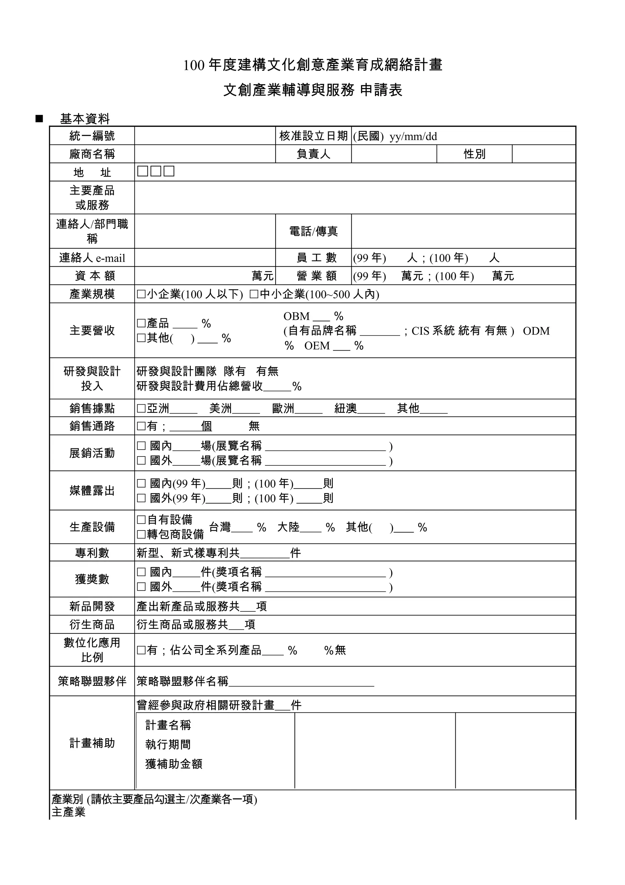 本文件为文化创意产业育成网络计划的申请表,收集申请者的基本信息及其产业背景,旨在提供辅导与服务。申请表涵盖企业基本资料、主要产品、研发情况及产业分类等多个方面,鼓励中小企业参与文化创意领域的发展。申请企业需确保提供的信息准确,并同意分享成果以促进产业推广。