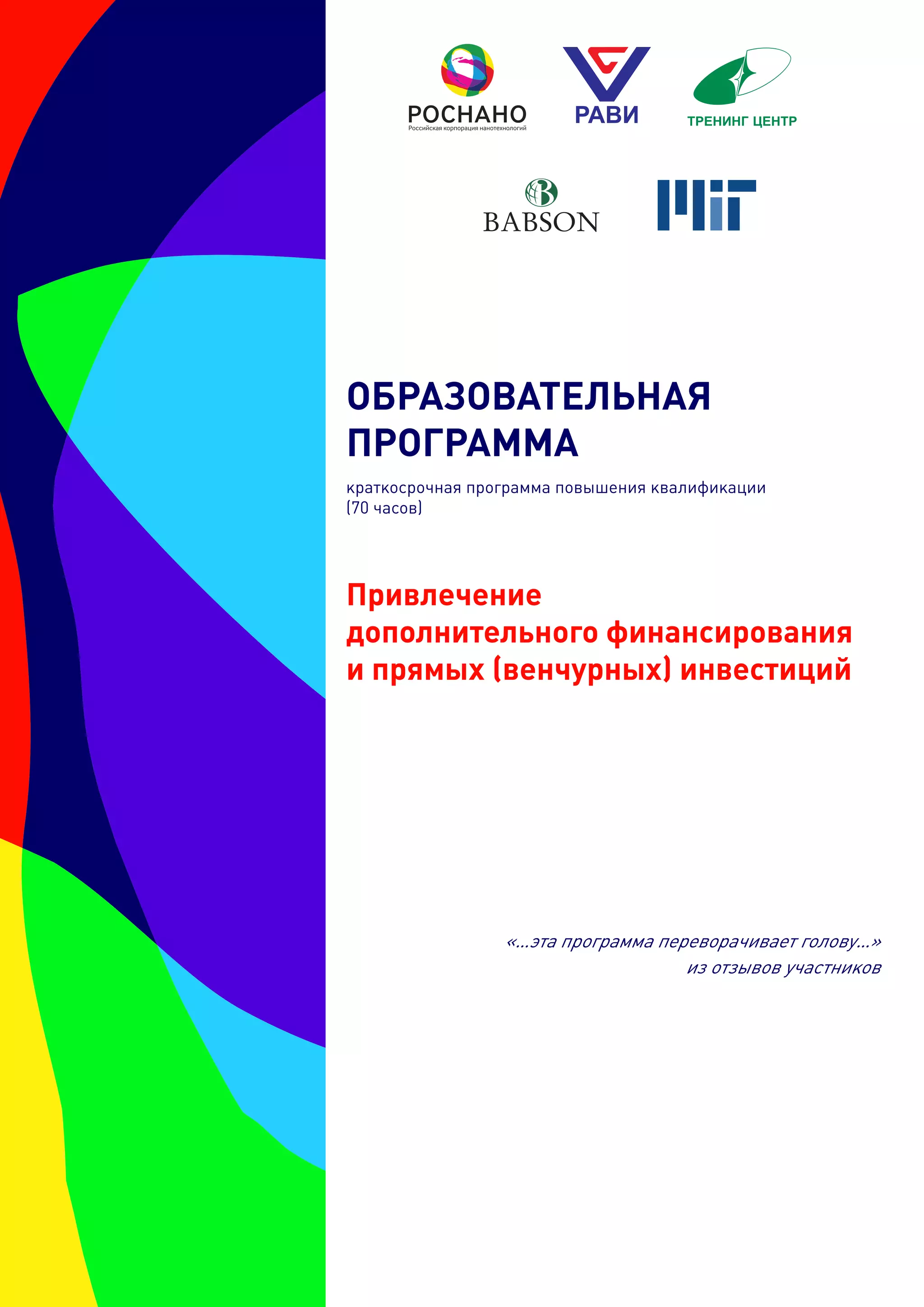 Документ описывает образовательную программу повышения квалификации, направленную на привлечение венчурных инвестиций для высокотехнологичных проектов. Программа включает как теоретические, так и практические аспекты, такие как формирование инвестиционных предложений и стратегического видения взаимодействия с инвесторами. Участники получают возможность интеграции в международное сообщество и взаимодействия с профессиональными инвесторами через различные сегменты рынка инноваций.