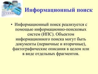 Документ описывает методы информационного поиска в интернете, включая использование информационно-поисковых систем и поисковых серверов. Приведены советы по эффективному поиску информации, а также перечислены популярные поисковые системы в Украине и за ее пределами. Также рассматриваются альтернативные методы поиска, такие как метапоиск и специализированные поисковые инструменты.