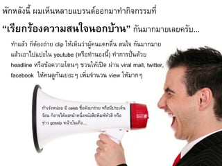 ทาแล้ว ก็ต้องถ่าย clip ให้เห็นว่าผู้คนแตกตื่น สนใจ กันมากมาย แล้วเอาไปแปะใน youtube (หรือทานองนี้) ทาการปั่นด้วย headline หรือข้อความโดนๆ ชวนให้เปิด ผ่าน viral mail, twitter, facebook ให้คนดูกันเยอะๆ เพิ่มจานวน view ให้มากๆ ถ้าเจ๋งหน่อย มี celeb ชื่อดังมาร่วม หรือมีประเด็น ร้อน ก็อาจได้ลงหน้าหนึ่งหนังสือพิมพ์หวสี หรือ ั ข่าว gossip หน้าบันเทิง....