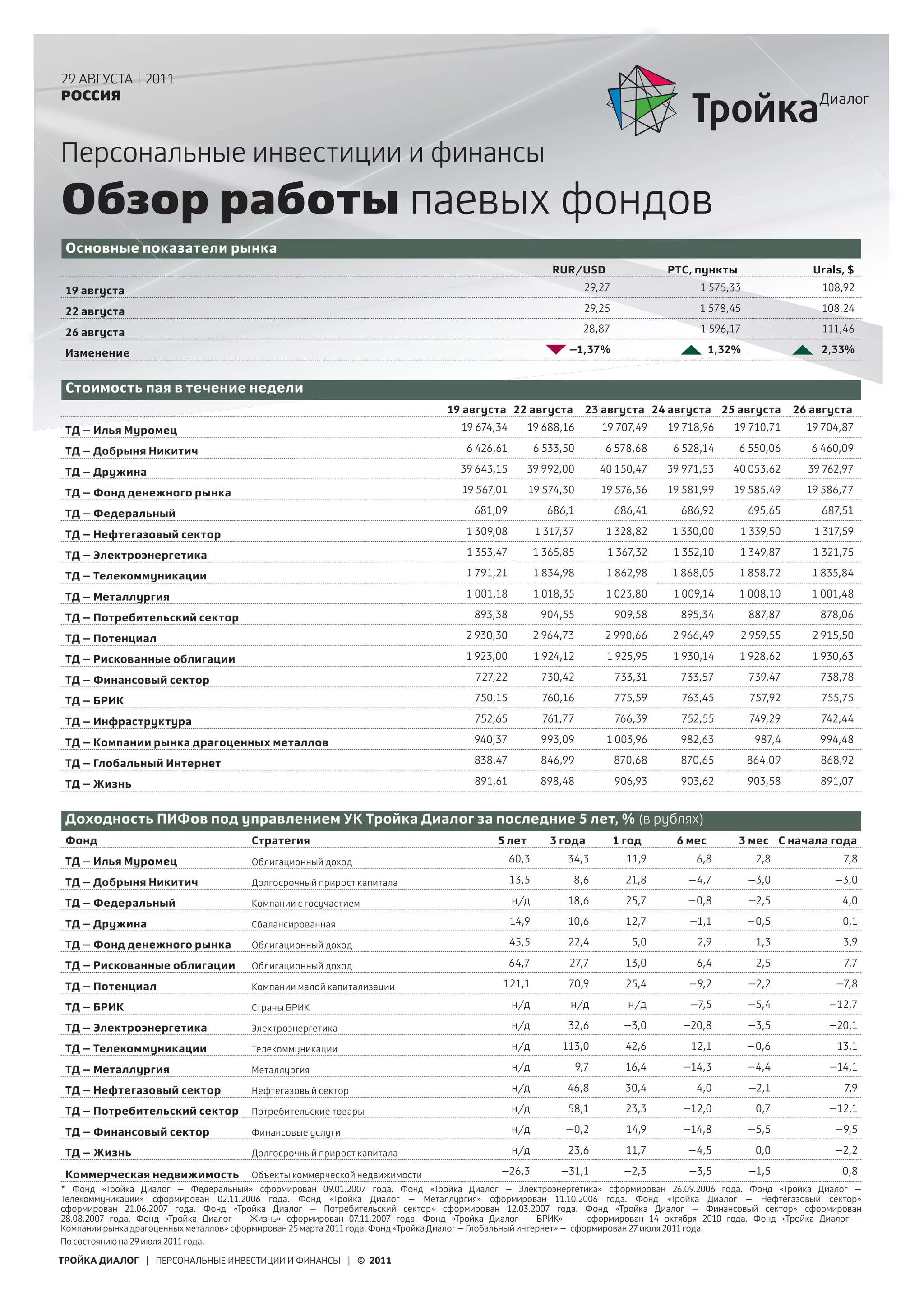Документ представляет собой обзор рынка паевых инвестиционных фондов в России за август 2011 года, включая основные фондовые показатели и изменения стоимости акций. Информация охватывает доходность различных фондов, макроэкономические факторы, влияющие на рынки, а также результаты и прогнозы ключевых отраслей, таких как нефтегазовый и телекоммуникационный. Отмечается, что российский рынок акций испытывает влияние мировых экономических событий и колебаний цен на нефть.