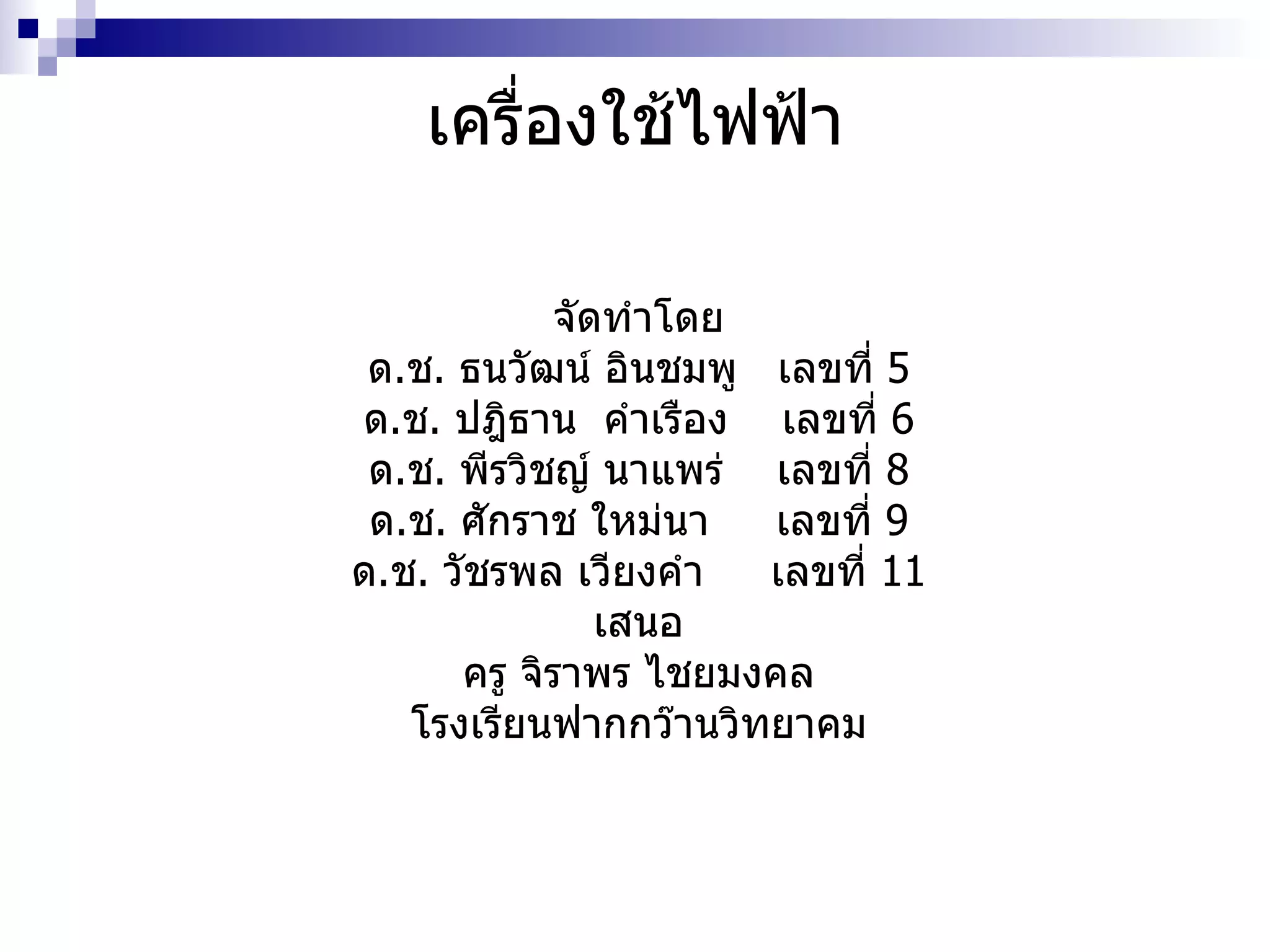 เครื่องใช้ไฟฟ้า จัดทำโดย ด. ช . ธนวัฒน์ อินชมพู เลขที่ 5 ด . ช . ปฎิธาน คำเรือง เลขที่ 6 ด . ช . พีรวิชญ์ นาแพร่ เลขที่ 8 ด . ช . ศักราช ใหม่นา เลขที่ 9 ด . ช . วัชรพล เวียงคำ เลขที่ 11 เสนอ ครู จิราพร ไชยมงคล โรงเรียนฟากกว๊านวิทยาคม - 2.