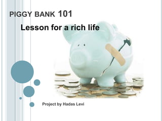 This document presents a proposal for a new economic education program in Israeli schools called "Piggy Bank." The program would teach elementary and middle school students basic financial literacy and management skills. It aims to foster a generation of Israelis with values of modesty and saving. University students would teach the program in schools as part of a scholarship program. The goals are to improve economic thinking, prevent future financial hardships, and ultimately change economic behavior and reduce poverty in Israel. Similar existing programs are mentioned as examples. Potential funding sources and feasibility issues are also briefly discussed.