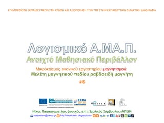 ...συνοπτική παρουσίαση του μικρόκοσμου του εικονικού εργαστηρίου μαγνητισμού (φύλλα εργασίας: δυναμικές γραμμές Ι, ένταση πεδίου I) του εκπαιδευτικού λογισμικού Α.ΜΑ.Π. (Ανοιχτό Mαθησιακό Περιβάλλον, έκδοση 2.2), μια και το λογισμικό δύσκολα εγκαθίσταται/τρέχει σε Windows Vista και Windows 7 και πολλά προβλήματα παρουσιάζει όταν τρέχει σε περιβάλλον Windows XP.
