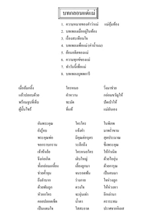 1. ความหมายของคาว่าแม่ แม่อุมท้อง ้ 2. ่ บทเพลงเมื่ออยูในท้อง 3. เรื่ องสะเทือนใจ 4. บทเพลงเพื่อแม่ (ค่าน้ านม) 5. ย้อนอดีตของแม่ 6. ความทุกข์ของแม่ 7. ทาวันนี้เพื่อแม่ 8. บทเพลงบุพพการี เมื่อล้มกลิ้ง ใครหนอ วิ่งมาช่วย แล้วปลอบด้วย คาหวาน กล่อมขวัญให้ พร้อมจูบที่เจ็บ ชะมัด ปัดเป่ าให้ ผูน้ นไซร้ ้ ั ที่แท้ แม่ฉนเอง ั อันพระคุณ ใครใคร ในพิภพ ยังรู้จบ แจ้งคา มาพร่ าขาน พระคุณพ่อ มีคุณต่อบุตร สุดประมาณ ขอกราบกราน ระลึกถึง ซึ่งพระคุณ เจ้าข้าเอ๋ ย ใครหนอใคร ให้กาเนิด จึงก่อเกิด เติบใหญ่ ด้วยไออุ่น ทั้งกล่อมเกลี้ยง เลี้ยงลูกมา ด้วยการุ ณ ช่วยค้ าจุน จนรอดพ้น เป็ นคนมา ถึงลาบาก ร่ างกาย ใจห่วงลูก ด้วยพันถูก ดวงใจ ให้ห่วงหา หัวอกใคร จะอุ่นเท่า อีกเล่านา คอยปลอดเช็ด น้ าตา คราระทม เป็ นแดนใจ ใสสะอาด ปราศจากกิเลส