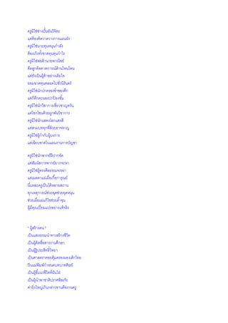 ้ แต่ต้องคิดวาดวางกางแผนผัง ครูมิใช่นายทุนหนุนกาลัง ต้ องเก็งทังขาดทุนตุนกาไร ้ ครูมิใช่พอค้ านายพาณิชย์ ่ ดีดลูกคิดคาดการณ์ด้านไหนไหน แต่ยงเป็ นผู้ค้าอย่างเต็มใจ ั ยอมขาดทุนตลอดไปชัวนิรันดร์ ่ ครูมิใช่นกปกครองช่าชองศึก ั แต่ก็คกคะนองปกปองขัน ึ ้ ้ ครูมิใช่นกวิชาการเชี่ยวชาญครัน ั แต่โชกโชนด้ วยผูกพันวิชาการ ครูมิใช่นกแสดงโลกแสงสี ั แต่สวมบททุกทีด้วยอาจหาญ ่ ครูมิใช่ผ้ กากับผู้บงการ ู แต่เฉียบขาดในแผนงานการบัญชา ครูมิใช่นกพากย์ฝีปากจัด ั แต่สมผัสการพากย์ยากจะหา ั ครูมิใช่ผ้ ทรงศีลธรรมจรรยา ู แต่เมตตาแผ่เผื่อเกื ้อการุณย์ นี่แหละครูเป็ นได้ หลายสถาน ทุกเหตุการณ์ชวยฉุดช่วยอุดหนุน ่ ช่วยเผื่อแผ่แก้ ไขช่วยค ้าจุน ผู้มีคณเปี่ ยมแปรอย่างแท้ จริง ุ * ผู้สร้ างคน * เป็ นแสงธรรมนาทางสร้ างชีวิต เป็ นผู้คิดสือสารงานศึกษา ่ เป็ นผู้ร้ ูประสิทธิ์วิทยา เป็ นศาสตราคอยคุ้มครองผองเด็กไทย ป็ นแม่พิมพ์กาหนดบทบาทศิษย์ เป็ นผู้ชี ้แนวชีวิตที่ฝันใฝ่ เป็ นผู้นาพาชาติปราศพิษภัย ค่ายิงใหญ่เกินกล่าวขานคืองานครู ่