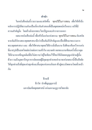 คำนำ ในหนังสือเล่มนี้รวบรวมและสกัดขึ้น พุทธวิธีในการสอน เพื่อให้เข้าถึง หลักการปฏิบัติธรรมอันแป็นเกี่ยวกับคาสอนที่เป็นพุทธพจน์หรือเถระ เถรีที่มี ความสาคัญยิ่ง โดยอ้างอิงจากพระไตรปิฏกและตาราอรรถกถา เจตนาหนังเสือเล่มนี้ เพื่อเข้าถึงแก่นแห่งธรรม พุทธวิธีในการสอน อันสกัด จากคัมภีร์ทางพระพุทธศาสนาถือว่าเป็นคัมภีร์สาคัญและเป็นที่ศึกษาของวงการ พระพุทธศาสนา และ เพื่อให้ศาสนาพุทธได้ธารงยิ่งยืนนาน จึงศึกษาค้นคว้าหาแห่ง ที่มาสรุปเป็นบทโดยย่อง่ายต่อความเข้าใจ และจดจา ผลของงานเขียนครั้งนี้บางจุด ได้นามาจากข้อมูลเดิมที่ยังไม่ทราบว่าผู้ใดเขียนไว้ก็ขอให้เกิดผลบุญแก่ท่านผู้นั้น ด้วย รวมถึงบุพการีครูอาจารย์ตลอดผู้มีคุณทุกท่านขออานาจแห่งเจตนานี้เป็นปัจจัย ให้ทุกท่านถึงที่สุดแห่งทุกข์และสิ้นสุดแห่งกองกิเลส เข้าสู่พระนิพพานโดยทั่วหน้า กัน ธีรเมธี ธีรวัส บาเพ็ญบุญบารมี มหาบัณฑิตพุทธศาสน์ แห่งมหามกุฏราชวิทยาลัย