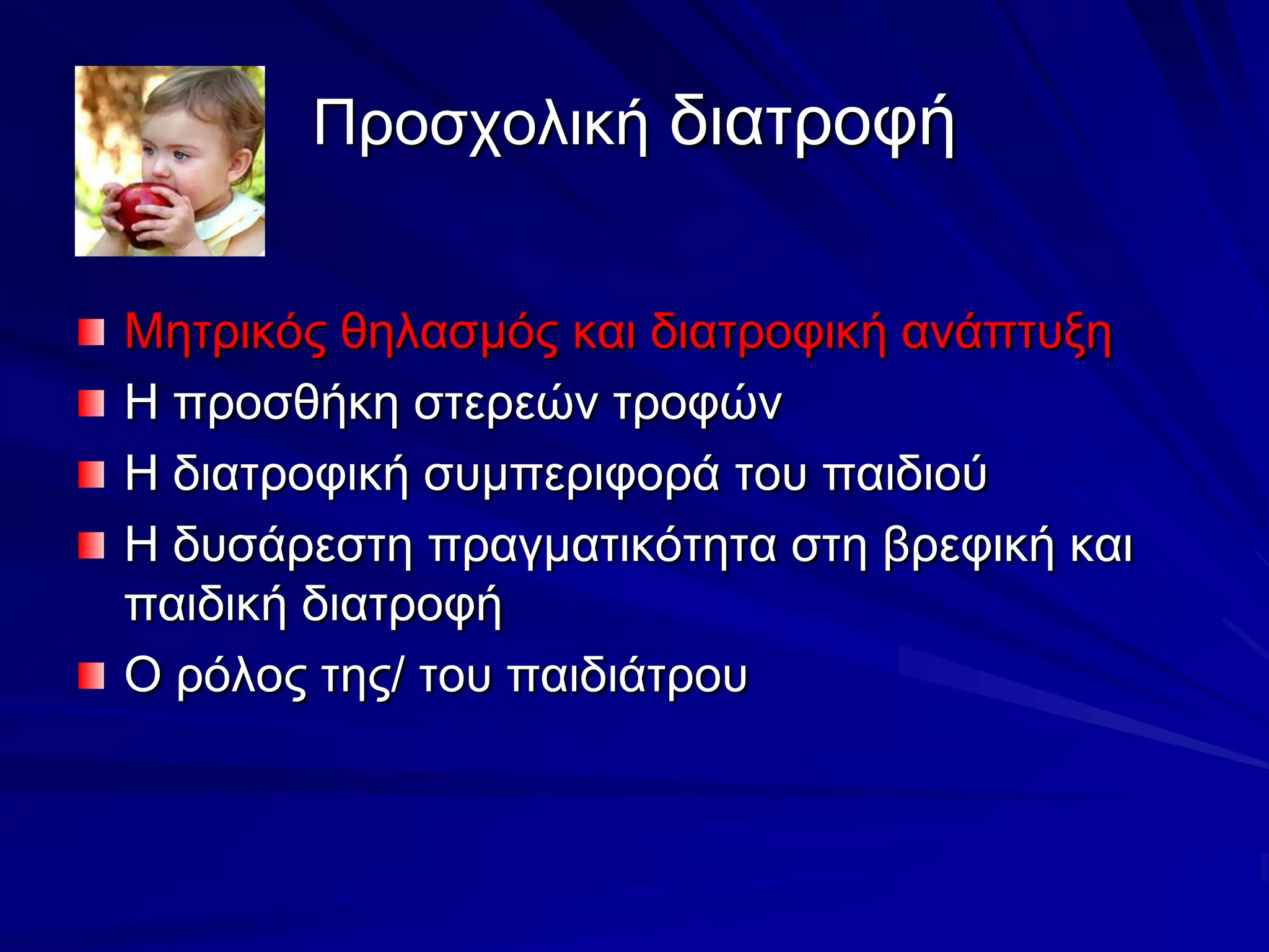 Προσχολική διατροφήΜητρικός θηλασμόςκαι διατροφική ανάπτυξηΗ προσθήκη στερεών τροφώνΗ διατροφική συμπεριφορά του παιδιούΗ δυσάρεστη πραγματικότητα στη βρεφική και παιδική διατροφήΟ ρόλος της/ του παιδιάτρου