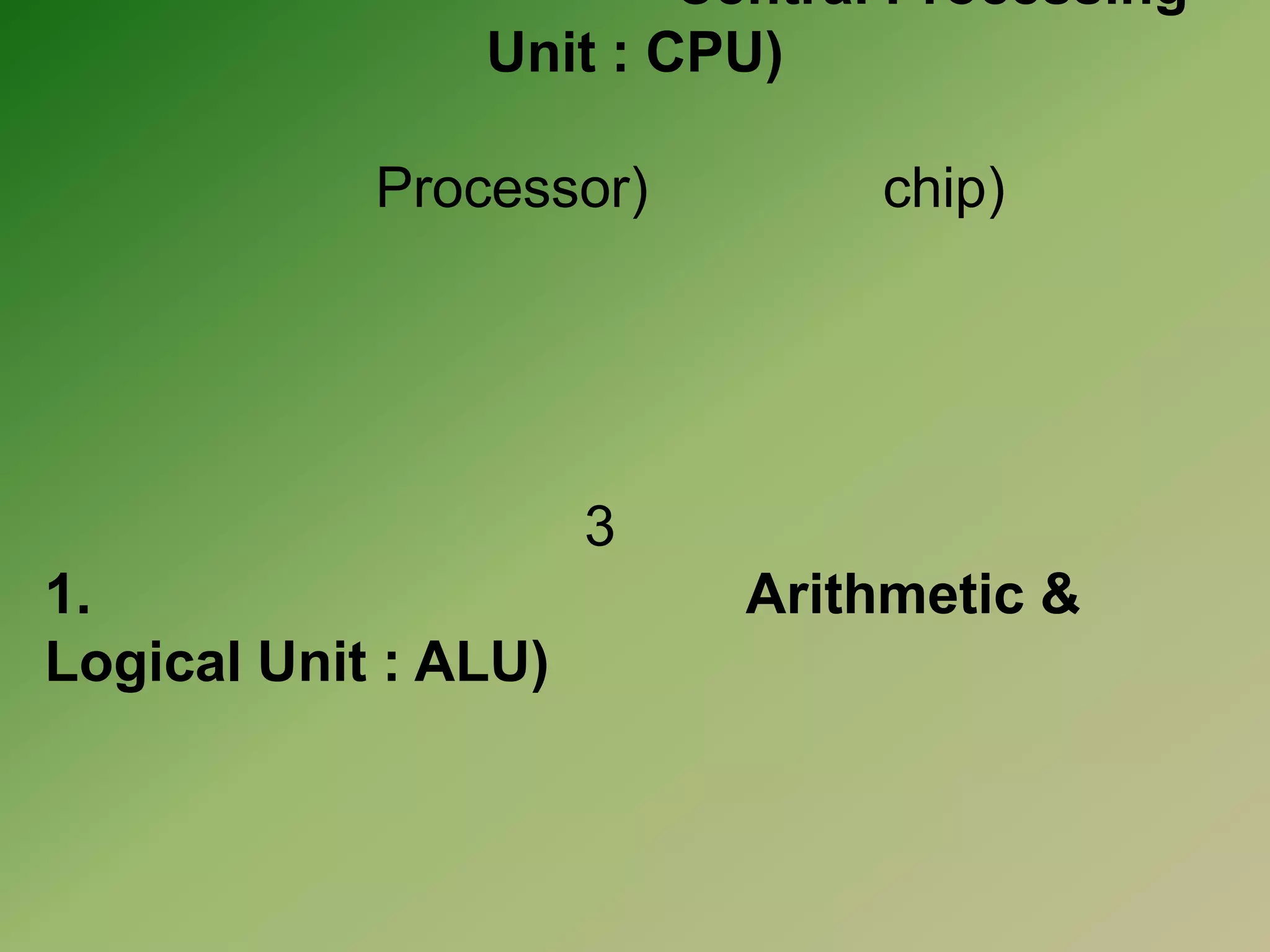 หน่วยประมวลผลของเครื่องคอมพิวเตอร์หน่วยประมวลผลกลาง (Central ProcessingUnit : CPU) หน่วยประมวลผลกลางหรือซีพียู เรียกอีกชื่อหนึ่งว่า โปรเซสเซอร์ (Processor) หรือ ชิป (chip) นับเป็นอุปกรณ์ ที่มีความสำคัญมากที่สุด ของฮาร์ดแวร์เพราะมีหน้าที่ในการประมวลผลข้อมูลที่ผู้ใช้ป้อน เข้ามาทางอุปกรณ์อินพุต ตามชุดคำสั่งหรือโปรแกรมที่ผู้ใช้ต้องการใช้งาน หน่วยประมวลผลกลาง ประกอบด้วยส่วนสำคัญ 3 ส่วน คือ1. หน่วยคำนวณและตรรกะ (Arithmetic & Logical Unit : ALU) หน่วยคำนวณตรรกะ ทำหน้าที่เหมือนกับเครื่องคำนวณอยู่ในเครื่องคอมพิวเตอร์โดยทำงานเกี่ยวข้องกับ การคำนวณทางคณิตศาสตร์ เช่น บวก ลบ คูณ หาร นอกจากนี้หน่วยคำนวณและตรรกะของคอมพิวเตอร์ ยังมีความสามารถอีกอย่างหนึ่งที่เครื่องคำนวณธรรมดาไม่มี คือ ความสามารถในเชิง - 3.