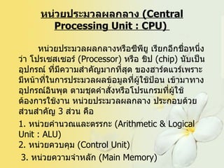 หน่วยประมวลผลกลาง (Central Processing Unit : CPU) หน่วยประมวลผลกลางหรือซีพียู เรียกอีกชื่อหนึ่งว่า โปรเซสเซอร์ ( Processor) หรือ ชิป ( chip) นับเป็นอุปกรณ์ ที่มีความสำคัญมากที่สุด ของฮาร์ดแวร์เพราะมีหน้าที่ในการประมวลผลข้อมูลที่ผู้ใช้ป้อน เข้ามาทางอุปกรณ์อินพุต ตามชุดคำสั่งหรือโปรแกรมที่ผู้ใช้ต้องการใช้งาน หน่วยประมวลผลกลาง ประกอบด้วยส่วนสำคัญ 3 ส่วน คือ 1. หน่วยคำนวณและตรรกะ ( Arithmetic & Logical Unit : ALU) 2. หน่วยควบคุม ( Control Unit) 3. หน่วยความจำหลัก ( Main Memory) - 3.