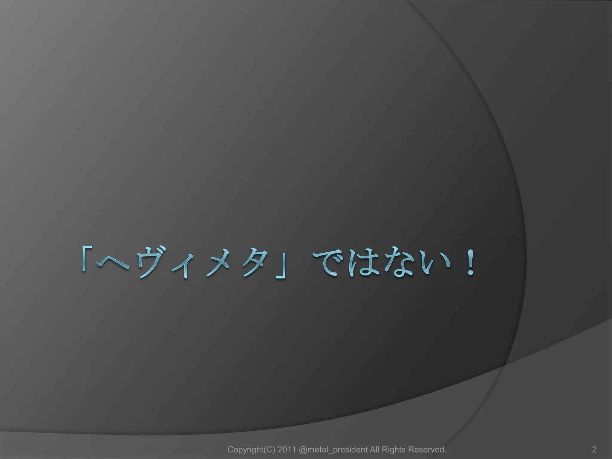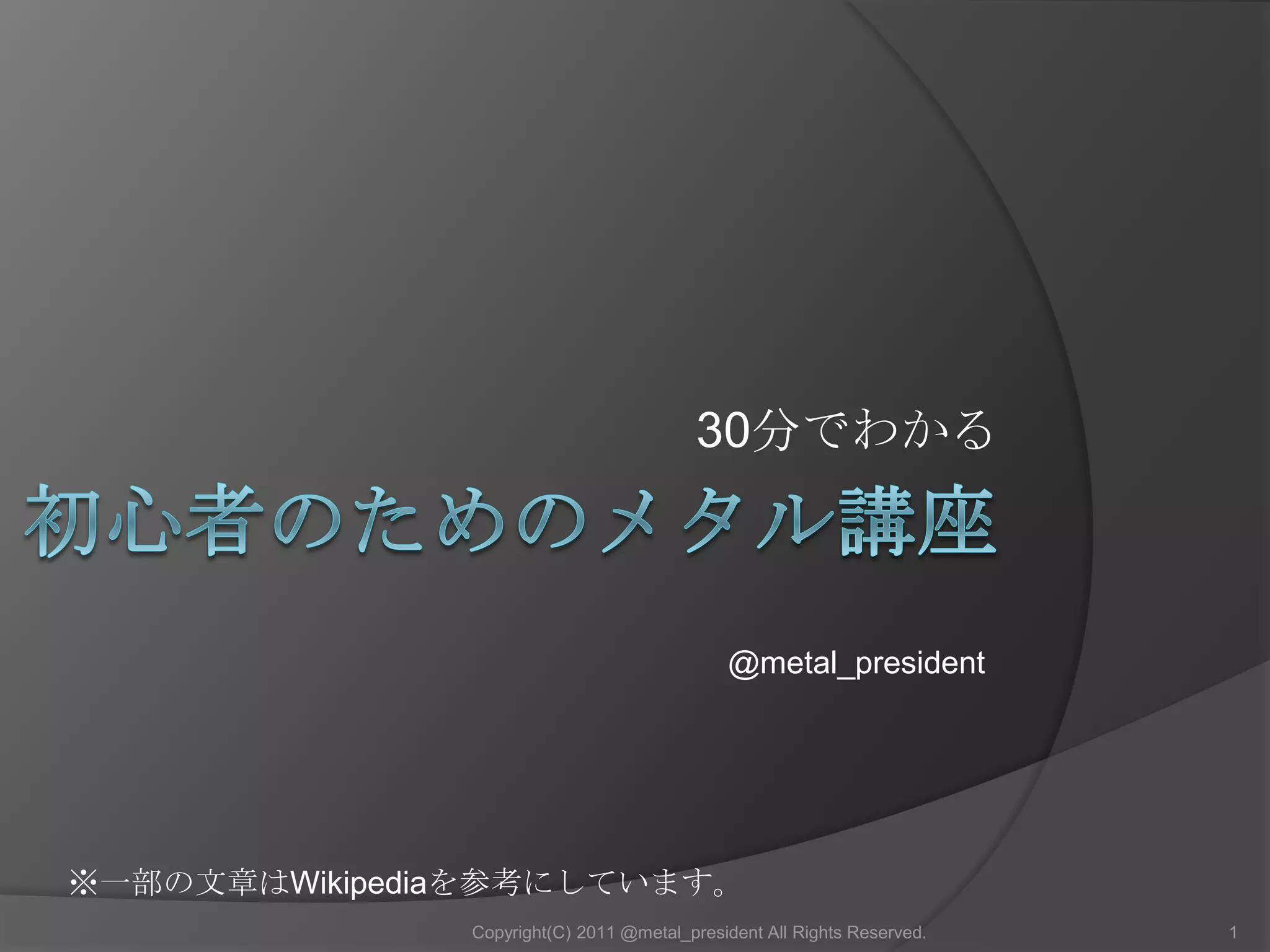 メタルの歴史 (諸説あるので一例として)1960年代後半の、 Cream 、Vanilla Fudge 、 Led Zeppelin 、 Deep Purpleなどのラウドロックが源流とされる。1970年UKデビューのブラックサバスが、明確なメタルの始まりとされている。 http://youtu.be/kz_6jagv_D41974年UKデビューのJudas Priest(=メタル・ゴッド)はメタルの様式を確立した立役者である。http://youtu.be/kUkhVmFq8qA http://youtu.be/psTUiQzNoxw1970年代後半にUKで多くの若手バンドが頭角を現した現象は、NWOBHM(New Wave Of British Heavy Metal)と呼ばれる。IRON MAIDEN やDef Leppardなどが有名である。 1980年代に入るとメタルの中心はアメリカへ。LAメタル、AUのAC/DC、DEのScorpions、日本のLOUDNESS、 Bon JoviやWhitesnake等が大ブレイク。7Copyright(C) 2011 @metal_president All Rights Reserved.