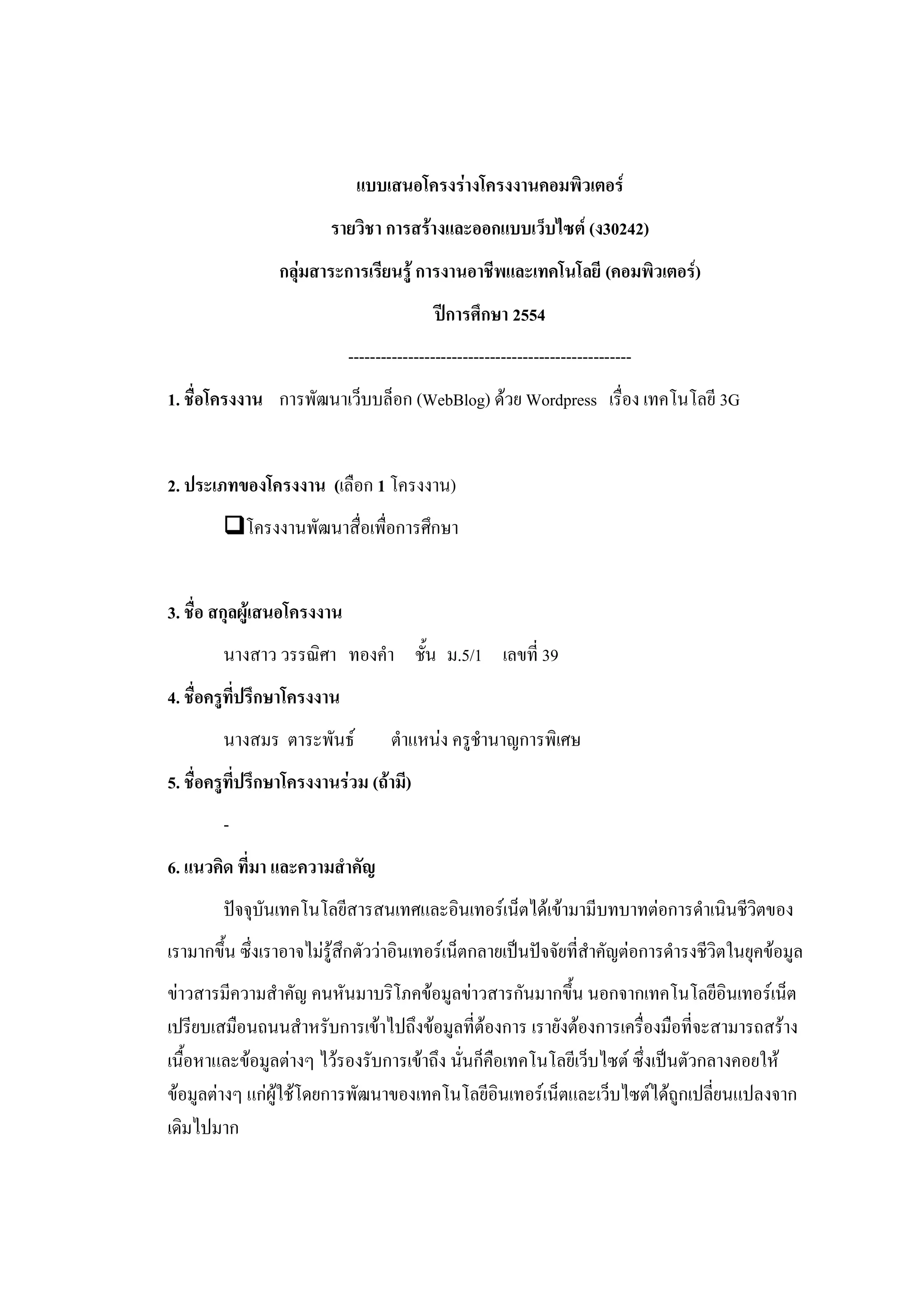 รายวิชา การสร้างและออกแบบเว็บไซต์ (ง30242) กลุ่มสาระการเรียนรู้ การงานอาชีพและเทคโนโลยี (คอมพิวเตอร์) ปีการศึกษา 2554 ---------------------------------------------------- 1. ชื่อโครงงาน การพัฒนาเว็บบล็อก (WebBlog) ด้วย Wordpress เรื่อง เทคโนโลยี 3G 2. ประเภทของโครงงาน (เลือก 1 โครงงาน) โครงงานพัฒนาสื่อเพื่อการศึกษา 3. ชื่อ สกุลผู้เสนอโครงงาน นางสาว วรรณิศา ทองคา ชั้น ม.5/1 เลขที่ 39 4. ชื่อครูที่ปรึกษาโครงงาน นางสมร ตาระพันธ์ ตาแหน่ง ครูชานาญการพิเศษ 5. ชื่อครูที่ปรึกษาโครงงานร่วม (ถ้ามี) - 6. แนวคิด ที่มา และความสาคัญ ปัจจุบันเทคโนโลยีสารสนเทศและอินเทอร์เน็ตได้เข้ามามีบทบาทต่อการดาเนินชีวิตของ เรามากขึ้น ซึ่งเราอาจไม่รู้สึกตัวว่าอินเทอร์เน็ตกลายเป็นปัจจัยที่สาคัญต่อการดารงชีวิตในยุคข้อมูล ข่าวสารมีความสาคัญ คนหันมาบริโภคข้อมูลข่าวสารกันมากขึ้น นอกจากเทคโนโลยีอินเทอร์เน็ต เปรียบเสมือนถนนสาหรับการเข้าไปถึงข้อมูลที่ต้องการ เรายังต้องการเครื่องมือที่จะสามารถสร้าง เนื้อหาและข้อมูลต่างๆ ไว้รองรับการเข้าถึง นั่นก็คือเทคโนโลยีเว็บไซต์ ซึ่งเป็นตัวกลางคอยให้ ข้อมูลต่างๆ แก่ผู้ใช้โดยการพัฒนาของเทคโนโลยีอินเทอร์เน็ตและเว็บไซต์ได้ถูกเปลี่ยนแปลงจาก เดิมไปมาก