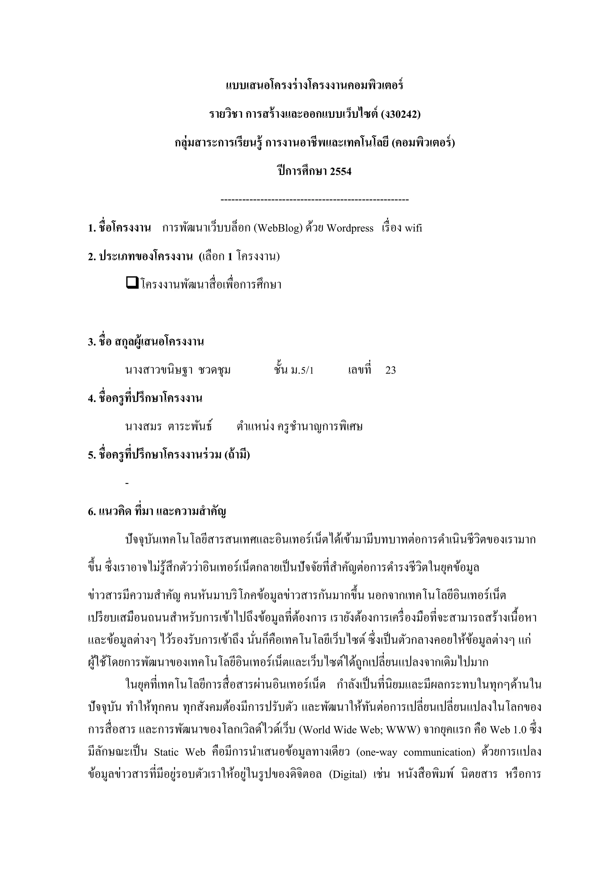 รายวิชา การสร้ างและออกแบบเว็บไซต์ (ง30242) กลุ่มสาระการเรียนรู้ การงานอาชี พและเทคโนโลยี (คอมพิวเตอร์ ) ปี การศึกษา 2554 ---------------------------------------------------- 1. ชื่อโครงงาน การพัฒนาเว็บบล็อก (WebBlog) ด้วย Wordpress เรื่ อง wifi 2. ประเภทของโครงงาน (เลือก 1 โครงงาน) โครงงานพัฒนาสื่ อเพื่อการศึกษา 3. ชื่ อ สกุลผู้เสนอโครงงาน นางสาวขนิษฐา ชวดชุม ชั้น ม.5/1 เลขที่ 23 4. ชื่ อครู ทปรึกษาโครงงาน ี่ นางสมร ตาระพันธ์ ตาแหน่ง ครู ชานาญการพิเศษ 5. ชื่อครู ทปรึกษาโครงงานร่ วม (ถ้ ามี) ี่ - 6. แนวคิด ทีมา และความสาคัญ ่ ปั จจุบนเทคโนโลยีสารสนเทศและอินเทอร์ เน็ตได้เข้ามามีบทบาทต่อการดาเนิ นชีวตของเรามาก ั ิ ขึ้น ซึ่ งเราอาจไม่รู้สึกตัวว่าอินเทอร์ เน็ตกลายเป็ นปั จจัยที่สาคัญต่อการดารงชีวตในยุคข้อมูล ิ ข่าวสารมีความสาคัญ คนหันมาบริ โภคข้อมูลข่าวสารกันมากขึ้น นอกจากเทคโนโลยีอินเทอร์เน็ต เปรี ยบเสมือนถนนสาหรับการเข้าไปถึงข้อมูลที่ตองการ เรายังต้องการเครื่ องมือที่จะสามารถสร้างเนื้ อหา ้ และข้อมูลต่างๆ ไว้รองรับการเข้าถึง นันก็คือเทคโนโลยีเว็บไซต์ ซึ่ งเป็ นตัวกลางคอยให้ขอมูลต่างๆ แก่ ่ ้ ผูใช้โดยการพัฒนาของเทคโนโลยีอินเทอร์เน็ตและเว็บไซต์ได้ถูกเปลี่ยนแปลงจากเดิมไปมาก ้ ในยุคที่เทคโนโลยีการสื่ อสารผ่านอินเทอร์ เน็ต กาลังเป็ นที่นิยมและมีผลกระทบในทุกๆด้านใน ปัจจุบน ทาให้ทุกคน ทุกสังคมต้องมีการปรับตัว และพัฒนาให้ทนต่อการเปลี่ยนเปลี่ยนแปลงในโลกของ ั ั การสื่ อสาร และการพัฒนาของโลกเวิลด์ไวด์เว็บ (World Wide Web; WWW) จากยุคแรก คือ Web 1.0 ซึ่ง มีลกษณะเป็ น Static Web คือมีการนาเสนอข้อมูลทางเดียว (one-way communication) ด้วยการแปลง ั ่ ่ ข้อมูลข่าวสารที่มีอยูรอบตัวเราให้อยูในรู ปของดิจิตอล (Digital) เช่น หนังสื อพิมพ์ นิตยสาร หรื อการ