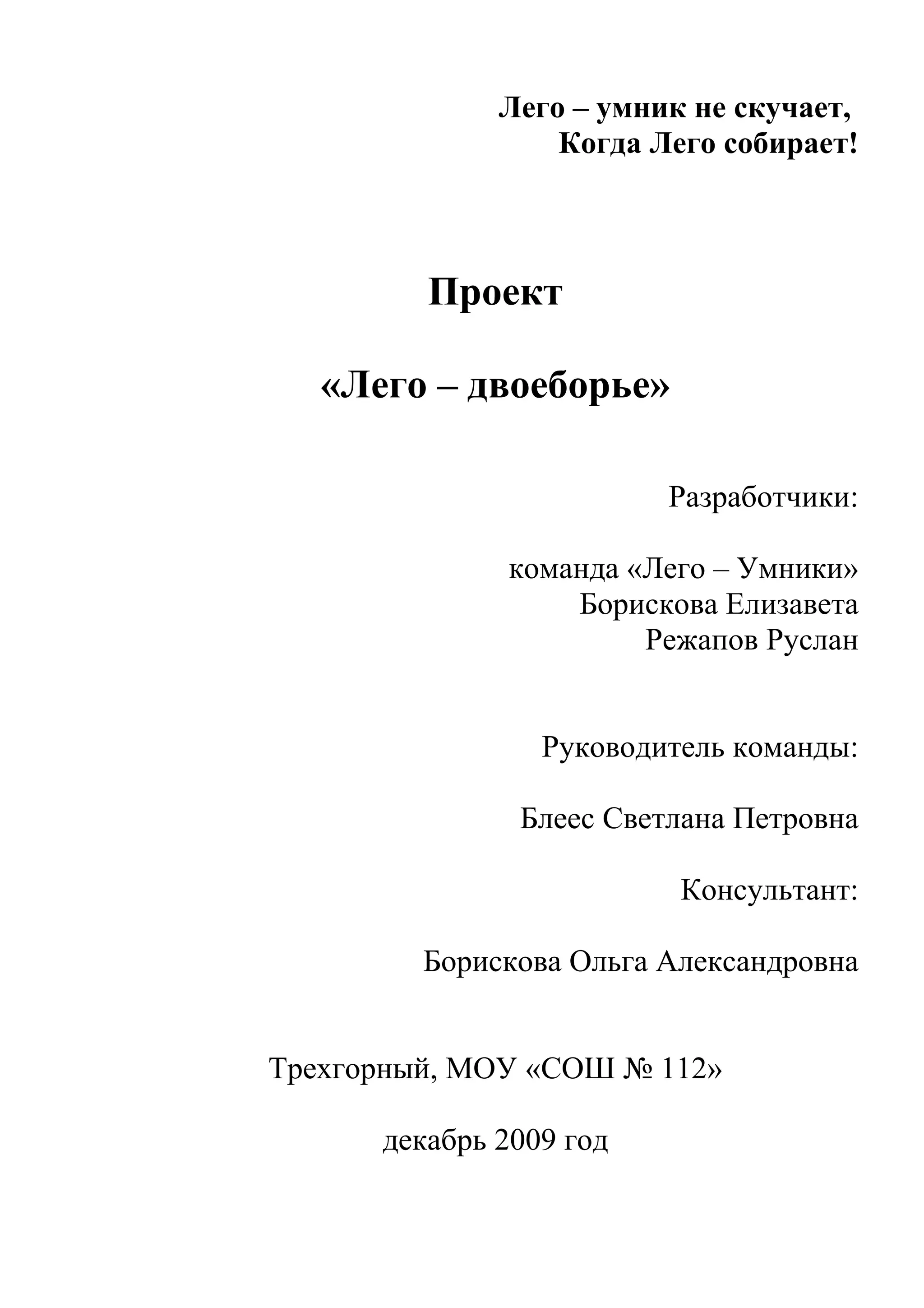 Проект 'Лего – двоеборье' направлен на создание робота-спортсмена, имитирующего действия стрелка и тяжелоатлета на базе набора NXT. Команда провела исследование спортивных состязаний, разработала модели и программы для роботов, столкнулась с множеством проблем, решая которые, использовала знания из различных дисциплин. В результате работы участники научились работать в команде и освоили принципы конструирования и программирования.