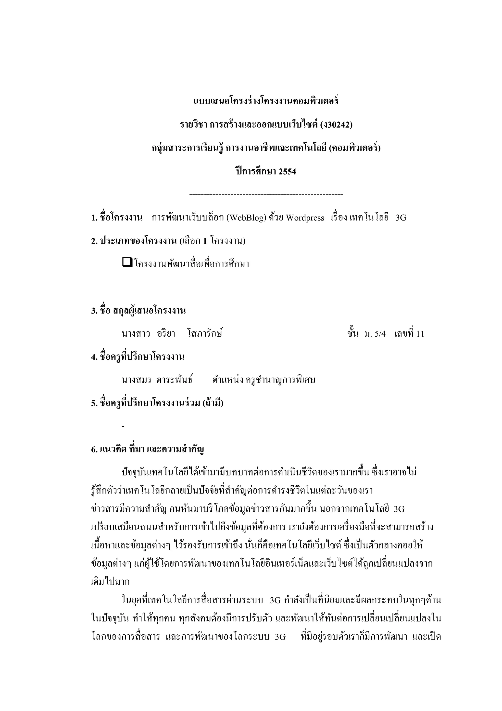 รายวิชา การสร้ างและออกแบบเว็บไซต์ (ง30242) กลุ่มสาระการเรียนรู้ การงานอาชี พและเทคโนโลยี (คอมพิวเตอร์ ) ปี การศึกษา 2554 ---------------------------------------------------- 1. ชื่อโครงงาน การพัฒนาเว็บบล็อก (WebBlog) ด้วย Wordpress เรื่ อง เทคโนโลยี 3G 2. ประเภทของโครงงาน (เลือก 1 โครงงาน) โครงงานพัฒนาสื่ อเพื่อการศึกษา 3. ชื่ อ สกุลผู้เสนอโครงงาน นางสาว อริ ยา โสภารักษ์ ชั้น ม. 5/4 เลขที่ 11 4. ชื่ อครู ทปรึกษาโครงงาน ี่ นางสมร ตาระพันธ์ ตาแหน่ง ครู ชานาญการพิเศษ 5. ชื่ อครู ทปรึกษาโครงงานร่ วม (ถ้ ามี) ี่ - 6. แนวคิด ทีมา และความสาคัญ ่ ปัจจุบนเทคโนโลยีได้เข้ามามีบทบาทต่อการดาเนิ นชีวตของเรามากขึ้น ซึ่งเราอาจไม่ ั ิ รู ้สึกตัวว่าเทคโนโลยีกลายเป็ นปัจจัยที่สาคัญต่อการดารงชี วตในแต่ละวันของเรา ิ ข่าวสารมีความสาคัญ คนหันมาบริ โภคข้อมูลข่าวสารกันมากขึ้น นอกจากเทคโนโลยี 3G เปรี ยบเสมือนถนนสาหรับการเข้าไปถึงข้อมูลที่ตองการ เรายังต้องการเครื่ องมือที่จะสามารถสร้าง ้ เนื้อหาและข้อมูลต่างๆ ไว้รองรับการเข้าถึง นันก็คือเทคโนโลยีเว็บไซต์ ซึ่งเป็ นตัวกลางคอยให้ ่ ข้อมูลต่างๆ แก่ผใช้โดยการพัฒนาของเทคโนโลยีอินเทอร์ เน็ตและเว็บไซต์ได้ถูกเปลี่ยนแปลงจาก ู้ เดิมไปมาก ในยุคที่เทคโนโลยีการสื่ อสารผ่านระบบ 3G กาลังเป็ นที่นิยมและมีผลกระทบในทุกๆด้าน ในปัจจุบน ทาให้ทุกคน ทุกสังคมต้องมีการปรับตัว และพัฒนาให้ทนต่อการเปลี่ยนเปลี่ยนแปลงใน ั ั ่ โลกของการสื่ อสาร และการพัฒนาของโลกระบบ 3G ที่มีอยูรอบตัวเราก็มีการพัฒนา และเปิ ด
