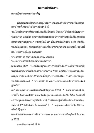 ผลการดำเนินงาน<br />ความเป็นมา และความสำคัญ<br/>พระบาทสมเด็จพระเจ้าอยู่หัวได้ทรงกล่าวถึงความรักชาติเพื่อเตือนสติคนไทยทั้งหลายในโอกาสต่างๆ ดังนี้ “คนไทยรักษาชาติรักษาแผ่นดินเป็นปึกแผ่น มั่นคงมาได้ด้วยสติปัญญาความสามารถ และด้วย คุณความดีอิสรภาพ เสรีภาพความร่มเย็นเป็นสุข ตลอดจนความเจริญทุกอย่างที่มีอยู่บัดนี้ เรา ทั้งหลายในปัจจุบัน จึงต้องถือเป็นหน้าที่รับผิดชอบ อย่างสำคัญ ในอันที่จะรักษาคุณความ ดีพร้อมทั้งจิตใจที่เป็นไทยไว้ให้มั่นคง ตลอดไป ” พระราชดำรัส ในการเสด็จออกมหาสมาคม ในงานพระราชพิธีเฉลิมพระชนมพรรษา 5 ธันวาคม 2521 \"