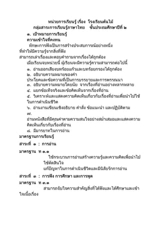 หน่วยการเรียนรู้ เรื่อง โรงเรียนต้นไม้<br />กลุ่มสาระการเรียนรู้ภาษาไทย ชั้นประถมศึกษาปีที่ ๒<br /> เป้าหมายการเรียนรู้<br />ความเข้าใจที่คงทน<br />ทักษะการฟังเป็นการสร้างประสบการณ์อย่างหนึ่ง ที่ทำให้มีความรู้จากสิ่งที่ฟัง สามารถเล่าเรื่องและตอบคำถามจากเรื่องได้ถูกต้อง<br />เมื่อเรียนจบหน่วยนี้ ผู้เรียนจะมีความรู้ความสามารถต่อไปนี้<br />๑. อ่านออกเสียงบทร้อยแก้วและบทร้อยกรองได้ถูกต้อง<br />๒. อธิบายความหมายของคำ ประโยคและข้อความที่เป็นการบรรยายและการพรรณนา<br />๓. อธิบายความหมายโดยนัย จากเรื่องที่อ่านอย่างหลากหลาย<br />๔. แยกข้อเท็จจริงและข้อคิดเห็นจากเรื่องที่อ่าน<br />๕. วิเคราะห์และแสดงความคิดเห็นเกี่ยวกับเรื่องที่อ่านเพื่อนำไปใช้ ในการดำเนินชีวิต <br />๖. อ่านงานเขียนเชิงอธิบาย คำสั่ง ข้อแนะนำ และปฏิบัติตาม<br />๗. อ่านหนังสือที่มีคุณค่าตามความสนใจอย่างสม่ำเสมอและแสดงความคิดเห็นเกี่ยวกับเรื่องที่อ่าน<br />๘. มีมารยาทในการอ่าน<br />มาตรฐานการเรียนรู้ <br />สาระที่ ๑ : การอ่าน<br />มาตรฐาน ท ๑.๑ใช้กระบวนการอ่านสร้างความรู้และความคิดเพื่อนำไปใช้ตัดสินใจ แก้ปัญหาในการดำเนินชีวิตและมีนิสัยรักการอ่าน <br />สาระที่ ๓ : การฟัง การศึกษา และการพูด <br />มาตรฐาน ท ๓.๑สามารถจับใจความสำคัญสิ่งที่ได้ฟังและได้ศึกษาและเข้าใจเนื้อเรื่อง <br />ถ้อยคำ การใช้น้ำเสียงและกิริยาท่าทางของผู้แสดงทรรศนะเรื่องที่ฟังและ<br />ศึกษาอย่างมีวิจารณญาณ<br />ตัวชี้วัด <br />มาตรฐาน ท ๑.๑<br />(๒) อธิบายความหมายของคำและข้อความที่อ่าน<br />(๓) ตั้งคำถามและตอบคำถามเกี่ยวกับเรื่องที่อ่าน<br />(๔) ระบุใจความสำคัญและรายละเอียดจากเรื่องที่อ่าน<br />สาระสำคัญ / ความคิดรวบยอด<br />การสร้างประสบการณ์จากเนื้อหา<br />- การตอบคำถามจากเรื่อง “โรงเรียนต้นไม้”<br />- การเล่าเรื่อง “โรงเรียนต้นไม้”<br />- การฟังเรื่อง “โรงเรียนต้นไม้”<br />ทักษะการคิด<br />คิดวิเคราะห์และแสดงความคิดเห็นเกี่ยวกับเรื่องที่อ่าน<br />คุณภาพที่พึงประสงค์ของผู้เรียน<br />๑. ฟังเรื่อง “โรงเรียนต้นไม้” แล้วตอบคำถามและเล่าเรื่องได้ถูกต้อง<br />๒. อ่านเรื่องที่เล่าได้ถูกต้อง<br />๓. คัดเรื่องจากแผนภูมิลงสมุดไว้ฝึกอ่านได้ถูกต้อง <br />การกำหนดหลักฐานผลการเรียนรู้<br />๒.๑ ชิ้นงาน / ภาระงาน <br />สรุปความคิดรวบยอด แล้วเขียนเป็นแผนผังความคิด<br />๒.๒ การวัดและการประเมินผล<br />๑. วิธีการวัดและประเมินผล <br />๑. สังเกตพฤติกรรมการเรียนของนักเรียน<br />๒. ตรวจความถูกต้องของแบบทดสอบก่อนเรียน<br />๓. ประเมินการฟัง<br />๒. เครื่องมือการวัดและประเมินผล<br />๑. แบบบันทึกพฤติกรรมการเรียน<br />๒. แบบบันทึกคะแ