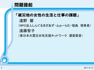 「被災地の女性の生活と仕事の課題」 遠野 馨 (NPO法人しんぐるまざあず・ふぉーらむ・福島 理事長) 遠藤智子 (東日本大震災女性支援ネットワーク 運営委員) 2 2011/9/13