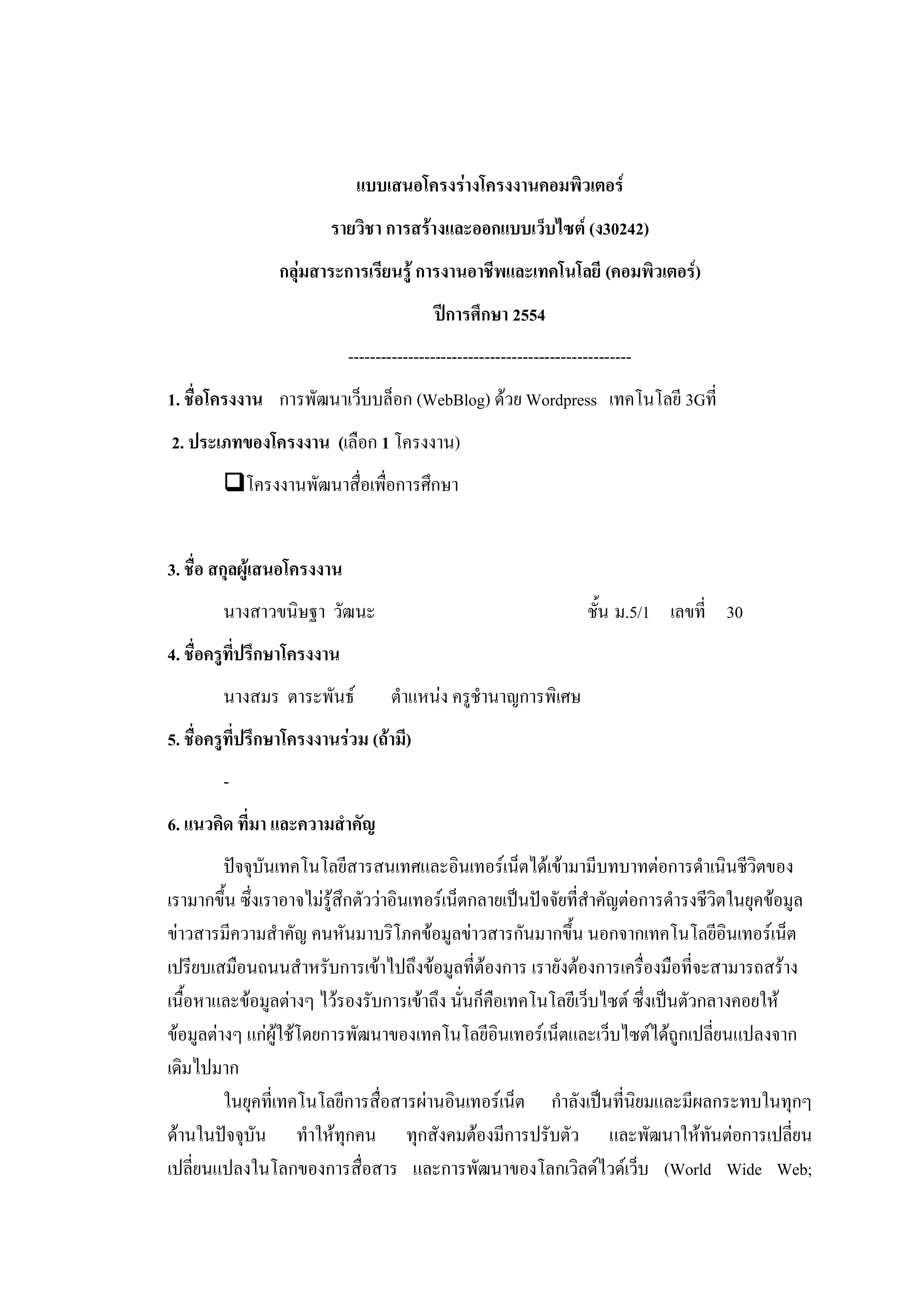รายวิชา การสร้างและออกแบบเว็บไซต์ (ง30242) กลุ่มสาระการเรียนรู้ การงานอาชีพและเทคโนโลยี (คอมพิวเตอร์) ปีการศึกษา 2554 ---------------------------------------------------- 1. ชื่อโครงงาน การพัฒนาเว็บบล็อก (WebBlog) ด้วย Wordpress เทคโนโลยี 3Gที่ 2. ประเภทของโครงงาน (เลือก 1 โครงงาน) โครงงานพัฒนาสื่อเพื่อการศึกษา 3. ชื่อ สกุลผู้เสนอโครงงาน นางสาวขนิษฐา วัฒนะ ชั้น ม.5/1 เลขที่ 30 4. ชื่อครูที่ปรึกษาโครงงาน นางสมร ตาระพันธ์ ตาแหน่ง ครูชานาญการพิเศษ 5. ชื่อครูที่ปรึกษาโครงงานร่วม (ถ้ามี) - 6. แนวคิด ที่มา และความสาคัญ ปัจจุบันเทคโนโลยีสารสนเทศและอินเทอร์เน็ตได้เข้ามามีบทบาทต่อการดาเนินชีวิตของ เรามากขึ้น ซึ่งเราอาจไม่รู้สึกตัวว่าอินเทอร์เน็ตกลายเป็นปัจจัยที่สาคัญต่อการดารงชีวิตในยุคข้อมูล ข่าวสารมีความสาคัญ คนหันมาบริโภคข้อมูลข่าวสารกันมากขึ้น นอกจากเทคโนโลยีอินเทอร์เน็ต เปรียบเสมือนถนนสาหรับการเข้าไปถึงข้อมูลที่ต้องการ เรายังต้องการเครื่องมือที่จะสามารถสร้าง เนื้อหาและข้อมูลต่างๆ ไว้รองรับการเข้าถึง นั่นก็คือเทคโนโลยีเว็บไซต์ ซึ่งเป็นตัวกลางคอยให้ ข้อมูลต่างๆ แก่ผู้ใช้โดยการพัฒนาของเทคโนโลยีอินเทอร์เน็ตและเว็บไซต์ได้ถูกเปลี่ยนแปลงจาก เดิมไปมาก ในยุคที่เทคโนโลยีการสื่อสารผ่านอินเทอร์เน็ต กาลังเป็นที่นิยมและมีผลกระทบในทุกๆ ด้านในปัจจุบัน ทาให้ทุกคน ทุกสังคมต้องมีการปรับตัว และพัฒนาให้ทันต่อการเปลี่ยน เปลี่ยนแปลงในโลกของการสื่อสาร และการพัฒนาของโลกเวิลด์ไวด์เว็บ (World Wide Web;