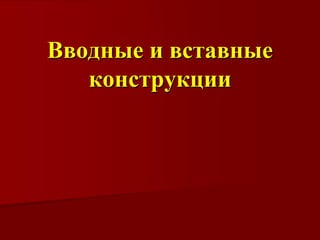 Документ описывает вводные и вставные конструкции в русском языке, включая их определение, правописание и группы по значению. Рассматриваются также правила обособления обращений и междометий в предложениях. Включены примеры использования вводных слов, а также различия между вводными и не вводными словами.