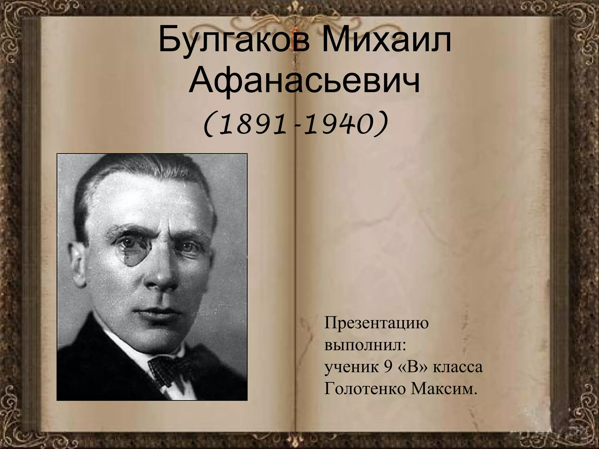 Документ представляет биографию Михаила Афанасьевича Булгакова, включая его детство, медицинское образование и деятельность врача, а также его литературную карьеру. Булгаков стал известным писателем, несмотря на жесткую критику со стороны советских властей и проблемами с публикацией его произведений. Он умер 10 марта 1940 года, после чего был похоронен на Новодевичьем кладбище в Москве.