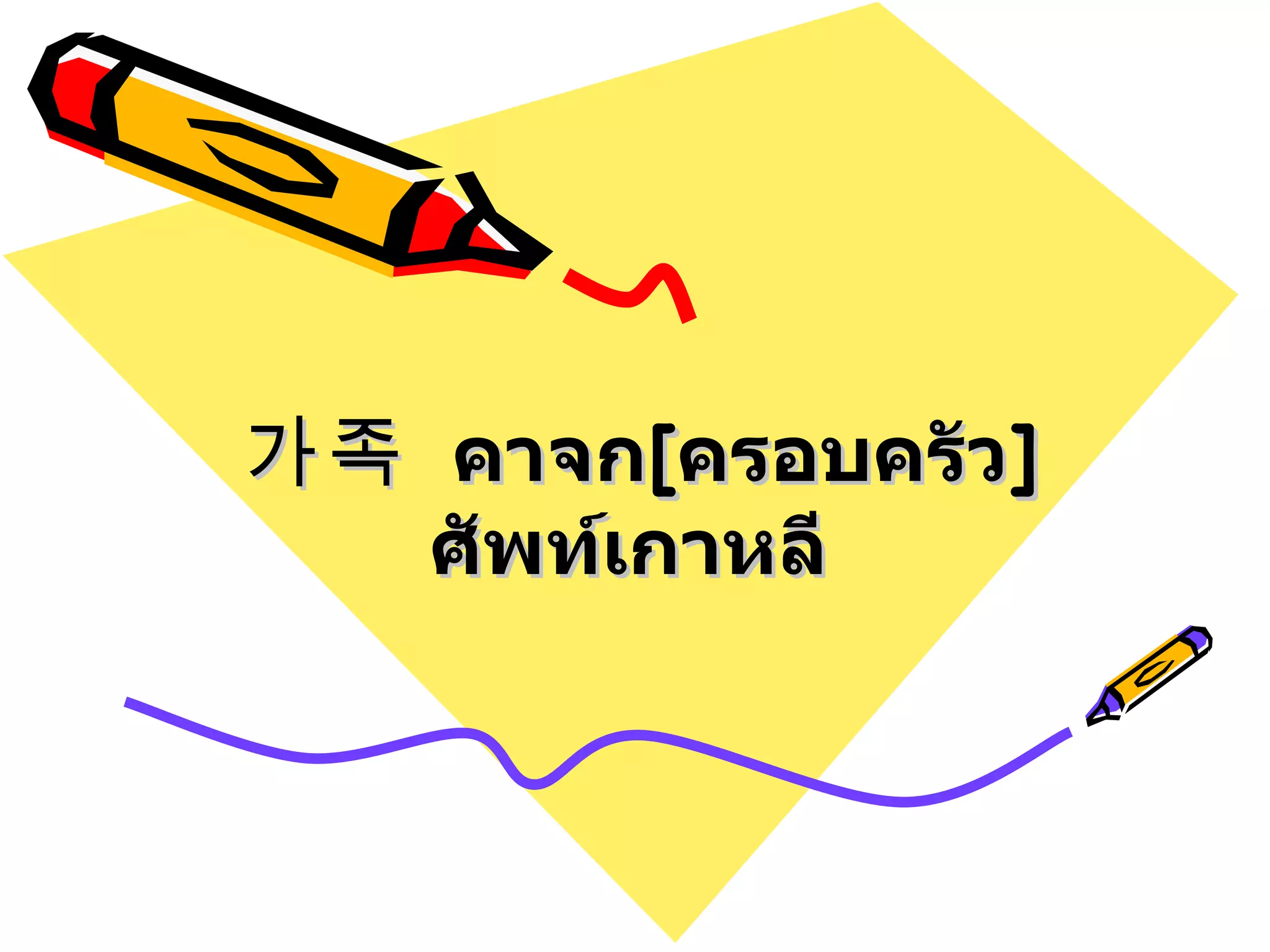 가족 ครอบครัว คาจก 아버지 พ่อ อาบอจี 어머니 แม่ ออ มอ นี 오빠 พี่ชาย ( ผู้หญิงเรียก ) โอ ปา 형 พี่ชาย ( ผู้ชายเรียก ) ฮยอง 누나 พี่สาว ( ผู้ชายเรียก ) นูนา 언니 พี่สาว ( ผู้หญิงเรียก ) ออนนี 남동생 น้องชาย นับ ทง แซง 여동생 น้องสาว ยอ ทง แซง 독자 ลูกชายคนเดียว ทก จา 무남독녀 ลูกสาวคนเดียว มู นับ ทก นยอ 막내 ลูกคนสุดท้าย มักแน 장남 พี่ชายคนโต ชังนับ 장녀 ลูกสาวคนโต ชัง นยอ 여자 ผู้หญิง ยอ จา 남자 ผู้ชาย นับ จา - 3.