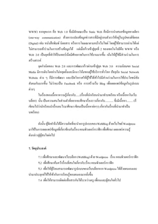 Web 1.0 ซึ่งมีลกษณะเป็ น Static Web คือมีการนาเสนอข้อมูลทางเดียว ั (one-way communication) ด้วยการแปลงข้อมูลข่าวสารที่มีอยูรอบตัวเราให้อยูในรู ปของดิจิตอล ่ ่ (Digital) เช่น หนังสือพิมพ์ นิตยสาร หรื อการโฆษณาตามหน้าเว็บไซต์ โดยผูใช้สามารถอ่านได้แต่ ้ ไม่สามารถเข้าร่ วมในการสร้างข้อมูลได้ แต่เมื่อก้าวเข้าสู่ยคที่ 2 ของเทคโนโลยีคือ WWW หรื อ ุ Web 2.0 เป็ นยุคที่ทาให้อินเทอร์เน็ตมีศกยภาพในการใช้งานมากขึ้น เน้นให้ผใช้มีส่วนร่ วมในการ ั ู้ สร้างสรรค์ จุดกาเนิดของ Web 2.0 และการพัฒนาก้าวผ่านเข้าสู่ยค Web 3.0 ความนิยมขอ Social ุ Media มีการเติบโตอย่างไม่หยุดยั้งและมีแนวโน้มของผูใช้บริ การทัวโลก ปัจจุบน Social Network ้ ่ ั Website ต่าง ๆ ก็มีการพัฒนา และเปิ ดโอกาสให้ผใช้ได้เข้าไปมีส่วนร่ วมในการใช้ประโยชน์เชิง ู้ สังคมกันมากขึ้น ไม่ว่าจะเป็ น Facebook หรื อ การสร้างเว็บ Blog เพื่อเผยแพร่ ขอมูลในรู ปแบบ ้ ต่างๆ ในเรื่ องของเนื้อหาความรู้เกี่ยวกับ......(เรื่ องที่นกเรี ยนนามาทาบทเรี ยน หรื อเนื้อหาในเว็บ ั บล็อก) นั้น เป็ นความสนใจส่วนตัวที่อยากจะศึกษาเรื่ องราวเกี่ยวกับ............ ซึ่งมีเนื้อหา......... (ก็ เขียนไปว่านักเรี ยนนาเรื่ องอะไรมาศึกษา เขียนเป็ นเนื้อหาย่อๆๆ เกี่ยวกับเรื่ องที่นามาทาเป็ น บทเรี ยน) ดังนั้น ผูจดทาจึงได้มีความคิดที่จะนาเอารู ปแบบของ WebBlog ด้วยเว็บไซต์ Wordpress ้ั มาใช้ในการเผยแพร่ ขอมูลที่เกี่ยวข้องกับเรื่ อง คอมพิวเตอร์กราฟิ ก เพื่อศึกษา เผยแพร่ ความรู้ ้ ดังกล่าวสู่ผสนใจต่อไป ู้ 7. วัตถุประสงค์ 7.1 เพื่อศึกษาและพัฒนาเว็บบล็อก (WebBlog) ด้วย Wordpress เรื่ อง คอมพิวเตอร์กราฟิ ก 7.2 เพื่อศึกษาค้นคว้าเรื่ องที่สนใจเกี่ยวกับ เรื่ อง คอมพิวเตอร์กราฟิ ก 7.3 เพื่อให้ผเู้ รี ยนสามารถพัฒนารู ปแบบของเว็บบล็อกจาก Wordpress ได้ดวยตนเองและ ้ นามาประยุกต์ใช้ให้เข้ากับการเรี ยนรู้ของตนเองมากยิงขึ้น ่ 7.4 เพื่อให้สามารถติดต่อสื่อสารกันได้ระหว่างครู เพื่อนและผูสนใจทัวไป ้ ่