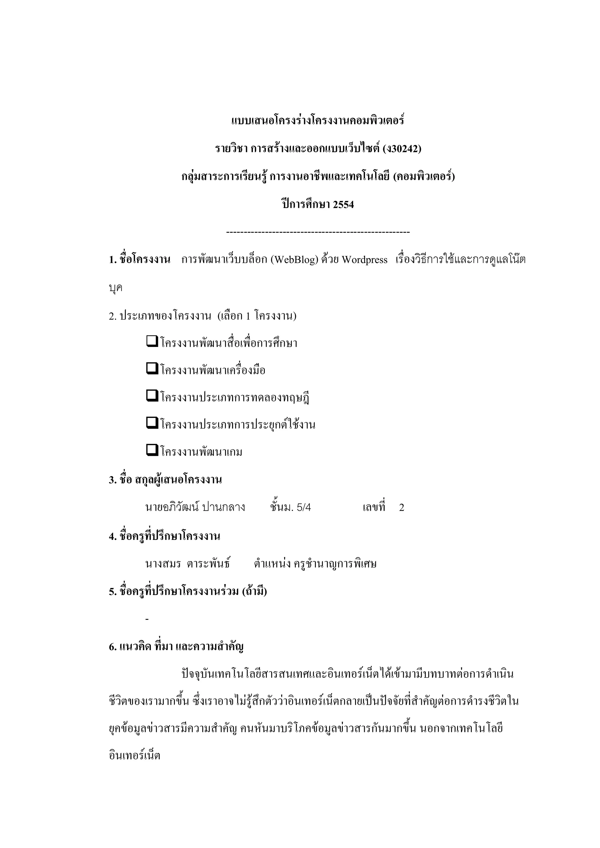 รายวิชา การสร้างและออกแบบเว็บไซต์ (ง30242) กลุ่มสาระการเรียนรู้ การงานอาชีพและเทคโนโลยี (คอมพิวเตอร์) ปีการศึกษา 2554 ---------------------------------------------------- 1. ชื่อโครงงาน การพัฒนาเว็บบล็อก (WebBlog) ด้วย Wordpress เรื่องวิธีการใช้และการดูแลโน๊ต บุค 2. ประเภทของโครงงาน (เลือก 1 โครงงาน) โครงงานพัฒนาสื่อเพื่อการศึกษา โครงงานพัฒนาเครื่องมือ โครงงานประเภทการทดลองทฤษฎี โครงงานประเภทการประยุกต์ใช้งาน โครงงานพัฒนาเกม 3. ชื่อ สกุลผู้เสนอโครงงาน นายอภิวัฒน์ ปานกลาง ชั้นม. 5/4 เลขที่ 2 4. ชื่อครูที่ปรึกษาโครงงาน นางสมร ตาระพันธ์ ตาแหน่ง ครูชานาญการพิเศษ 5. ชื่อครูที่ปรึกษาโครงงานร่วม (ถ้ามี) - 6. แนวคิด ที่มา และความสาคัญ ปัจจุบันเทคโนโลยีสารสนเทศและอินเทอร์เน็ตได้เข้ามามีบทบาทต่อการดาเนิน ชีวิตของเรามากขึ้น ซึ่งเราอาจไม่รู้สึกตัวว่าอินเทอร์เน็ตกลายเป็นปัจจัยที่สาคัญต่อการดารงชีวิตใน ยุคข้อมูลข่าวสารมีความสาคัญ คนหันมาบริโภคข้อมูลข่าวสารกันมากขึ้น นอกจากเทคโนโลยี อินเทอร์เน็ต
