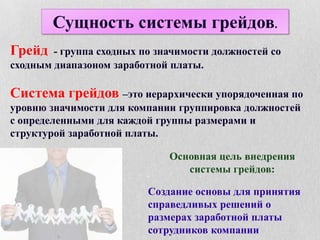 Документ описывает разработку системы грейдов, которая классифицирует должности по значимости и диапазону заработной платы. Основные цели системы включают обеспечение прозрачности, справедливости и соответствия бизнес-интересам компании. Работа включает этапы проектирования, описание должностей и методы их оценки, чтобы создать иерархию и структуру вознаграждения для сотрудников.