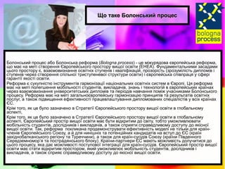 Що таке Болонськийпроцес Болонський процес або Болонська реформа ( Bologna process ) - це міжурядова європейська реформа, що має на меті створення Європейського простору вищої освіти (EHEA). Фундаментальними засадами цього простору є, взаємовизнання освітніх ступенів і кваліфікацій, прозорість (зрозумілість дипломів і ступенів через створення спільної триступеневої структури освіти) і європейська співпраця у сфері гарантії якості освіти. Реформа є сукупністю інструментів гармонізації національних освітніх систем в Європі. Ця реформа має на меті полегшення мобільності студентів, викладачів, знань і технологій в європейських країнах через взаємовизнання університетських дипломів та періодів навчання поміж учасниками Болонського процесу. Реформа має на меті загальноєвропейську гармонізацію принципів та результатів освітніх послуг, а також підвищення ефективності працевлаштування дипломованих спеціалістів у всіх країнах ЄС. Крім того, як це було зазначено в Стратегії Європейського простору вищої освіти в глобальному аспекті, Крім того, як це було зазначено в Стратегії Європейського простору вищої освіти в глобальному аспекті, Європейський простір вищої освіти має бути відкритим до світу, тобто уможливлювати мобільність студентів, дослідників і викладачів, а також сприяти справедливому доступу до якісної вищої освіти. Так, реформа покликана продемонструвати ефективність моделі не тільки для країн-членів Європейського Союзу, а й для нинішніх та потенційних кандидатів на вступ до ЄС (країн західнобалканського регіону та Туреччини), а також для країн-сусідів Союзу (країни Південного Середземномор’я та пострадянського блоку). Країни-партнери ЄС мають можливість долучитися до цього процесу, яка дає можливості поступової інтеграції для країн-сусідів. Європейський простір вищої освіти має стати відкритим простором, який уможливлює мобільність студентів, дослідників і викладачів, а також сприяє справедливому доступу до якісної вищої освіти.