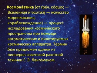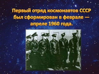 Документ описывает историю и развитие космонавтики, начиная с первых искусственных спутников и полетов человека в космос. Упоминаются ключевые фигуры, такие как Юрий Гагарин и Валентина Терешкова, а также важные достижения и события в этой сфере. В тексте также обсуждаются аспекты подготовки космонавтов и вопросы, связанные с условиями жизни в космосе.