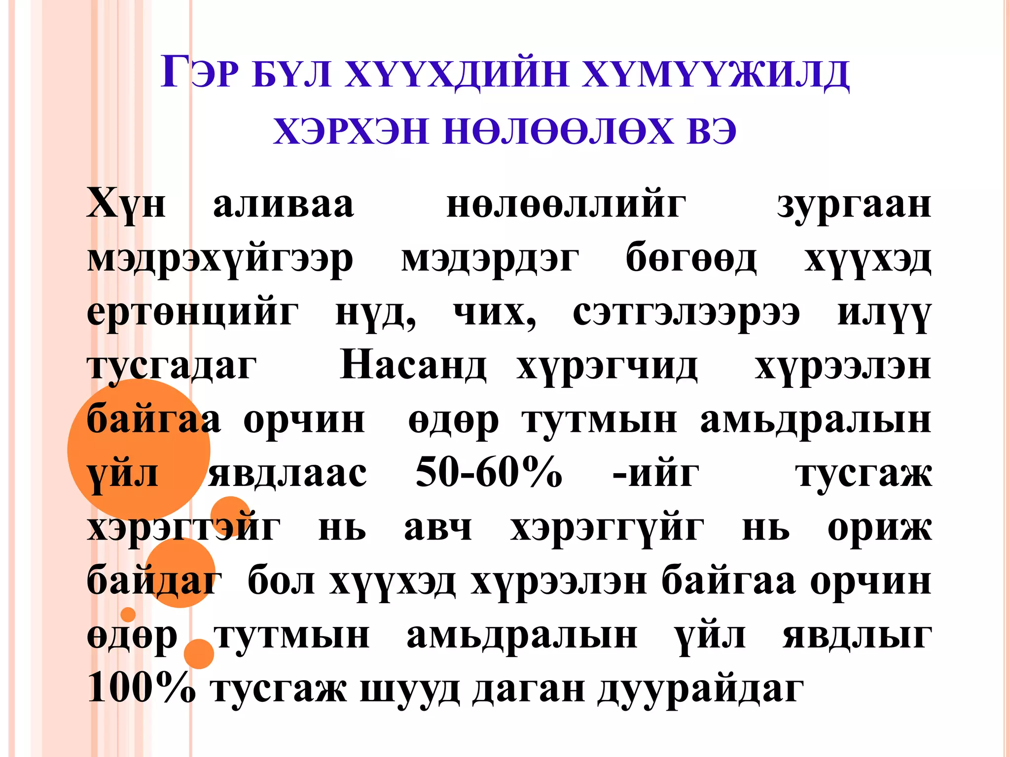 гэр бүл хүүхдийн хүмүүжилд хэрхэн нөлөөлөх вэ 1. Гэр бүл хүүхдийн хүмүүжилд хэрхэн нөлөөлөх вэХүналиваанөлөөллийгзургаанмэдрэхүйгээрмэдэрдэгбөгөөдхүүхэдертөнцийгнүд, чих, сэтгэлээрээилүүтусгадаг Насанд хүрэгчид хүрээлэн байгаа орчин өдөр тутмын амьдралын үйл явдлаас 50-60% -ийг тусгаж хэрэгтэйг нь авч хэрэггүйг нь ориж байдаг бол хүүхэд хүрээлэн байгаа орчин өдөр тутмын амьдралын үйл явдлыг 100% тусгаж шууд даган дуурайдаг 2. Тийм ч учраасМонголтүмэнхүүхдээхайрлахдаа "0 -3 настныгхаанмэттахих, 4 - 7 настныгхамтанмэттойлох, 8 - 13 настныгхарцмэтсургах, 14 - 18 настныгханьмэтзөвлөх" гэжэрхэмлэндээдэлжирсэнуламжлалтай. Эрдэмтдийнгаргасантообаримтаасүзвэлхүнийоюунычадварын 50 хувьнь 0 - 4 нас, 30 хувьнь 5 - 8 нас, үлдсэн 20 хувьнь 9 - 18 насандсуусанбайдаг.Хүүхдийнхөгжлийнанхдагчбөгөөдаминчухалорчинньгэрбүл. 3. Гэр бүл дэх насандхүрэгчдийнбурууүлгэрдуурайлалхүүхдийнхүмүүжилднөлөөлснөөрдараахүрдагаврыгавчирдагбайна.Дарангуйлахньхатуугараарбарьжхүмүүжүүлэхийгилүүдүздэгхандлагабөгөөдхүүхдийгхудалч, аймхай, догшинболгодог. 4. 5. Яншинүглэхньөөрийгөөбүхнийгмэддэг, чаддаг, хүүхдээюу ч чадахгүйгэсэнхандлагабөгөөдхүүхдийгбусдынгархарсан, идэвхгүй, сэтгэлийнхөдөлгөөнгүй, зорилгогүйболгодог.Хэтхайрлахньхүүхдэээрхлүүлэх, бөөцийлөх, дурзоргоорньбайлгаххандлагабөгөөдхүүхдийгбиедаахчадваргүй, магтаал, хайрхаламжиддуртай, тунирхууболгодог. 6. 7. 8. 9. Дарангуйлан захирах хайр Та нарыг хооллож хувцаслаж байна, тэжээж тэтгэж байна, эцэг эхдээ үг дуугүй захирагдаж үйлчилж байх ёстой гэсэн байр сууринаас хайрлахХор холбогдол нь Хүнийг хайрлах чадваргүй хахир хатуу зантай,бусдад дээрэнгүй,ачирхуу, бусдын эрх чөлөөг хүндэтгэдэггүй хүмүүс болох магадлалтай 10. Хор холбогдолХүмүүсийн хоорондын сэтгэлийн нандин холбоо харамгүй хайр байдаг гэдгийг ойлгох чадваргүй эдп хөрөнгөөр бүхнийг орлуулж хэмжиж болно гэж үздэг бэртэгчин хүмүүс болж өсдөгХудалдан авах хайрХайр энэрлээ хөрөнгө мөнгө хувцас хунар зэргээр хэмжээсжүүлдэг хайр. Үр хүүхэддээ хэдий чинээ их хөрөнгө мөнгө зарцуулна төдий чинээ их хайрлаж байна гэж үздэг эцэг эхчүүд 11. Айлын ямар хүүхэд вэУуган хүүхэд : дүүтэй болсоноор эрх мэдлээ алдсан мэт санагдаж хувиаа болрлуулах арга замаа олж хуучинсаг үзэлтэй эрх мэдэл, ахлах захлах дуртай хүмүүс болж мэддэгУдаах хүүхэд: Ах эгчээсээ илүү гэдгээ батлан харуулахын тулд байнга чармайж амжилтанд хүрэхээр тэмүүлэж байдаг тэдний хор шарыг хэт хөдөлгөвөл өрсөлдөмтгий, атаархуу,өөрийн хүч хүрэхгүй зорилгыг өмнөө тавьж түүндээ хүрэхгүй бол сэтгэлээр унан гонсойдог хүн болж мэднэОтгон хүүхэд: Зөвхөн эцэг эхийн төдийгүй ах эгч нарын анхааралд байдаг учраас отгон хүүхдийн байдал гайхамшигтай байдаг боловч хүн бүр зааж зааварлаад байвал тэд зөрүүд хэний ч үгийг сонсдоггүй дуулгаваргүй нэгэн болж өсч мэднэАйлын ганц хүүхэд:Тэдний байдал гайхалтай сайхан боловч хэт их халамжийг орчноосоо хүсэх,хэт бөөцийлсөн,амин хувиа хичээсэн бусадтай харилцах чадваргүй нэгэн болж мэднэ 12.
