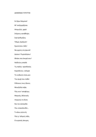 ΔΑΙΜΟΝΑΣ ΓΗΤΕΥΤΗΣ<br />Σεξέρω δαίμονα!<br />Μ’ επεξεργάζεσαι<br />Απομυζείς χαρά<br />Σπέρνεις κατάθλιψη<br />Σιγά ψιθυρίζεις<br />Τόλμα, ξερίζωσε!<br />Ερωτεύσου πάλι!<br />Να ριχτείς στη φωτιά!<br />Δώσου! Πυρπολήσου!<br />Φτάσε στα όνειρά σου!<br />Χαϊδεύεις απαλά <br />Τις παλιές προσδοκίες<br />Κοροϊδεύεις σκληρά<br />Το ευάλωτο είναι μου<br />Την ψυχή που ποθεί<br />Ρόδινους τους ήλιους<br />Μενεξεδιά νέφη<br />Πώς να σ’ αποφύγω;<br />Μαγικός, θελκτικός<br />Λησμονώ τη δύση <br />Και την καταιγίδα<br />Που επακολουθεί…<br />Τι κάνω γητευτή;<br />Πού μ’ οδηγείς πάλι;<br />Ο ουρανός άπειρος<br />Η θάλασσα βαθιά<br />Κι εγώ αποσταμένη<br />Ες αεί βυθισμένη <br />Στους κρουνούς των δακρύων<br />Δαίμονα γητευτή!<br />Έλεος δεν ποιείς ποτέ<br />Σε πιστό σου λάτρη;<br />Μάταια σου θυσιάζω<br />Στο Πανσέληνο Φως; <br />