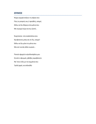 <br />ΘΥΜΟΣ<br />Νύχια γαμψά σκίζουν τη σάρκα σου<br />Πώς το μπορείς να μ’ αρνηθείς, καημέ;<br />Θέλω να δω δάκρυα στα μάτια σου<br />Με συριγμό αίμα να πιω ζεστό…<br />Νυχτοπατώ στα σκαλοπάτια σου<br />Κρυφοκοιτώ μπας και σε δω, καημέ!<br />Θέλω να δω μόνο τα μάτια σου<br />Μα εσύ κοιτάς άλλο ουρανό…<br />Πονούν φριχτά τα φυλλοκάρδια μου<br />Χτυπά ο σφυγμός ,φλέβες ακροβατούν<br />Να ‘σουν εδώ με τα κομμάτια σου<br />Τρελό χορό, να εκδικηθώ<br />