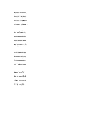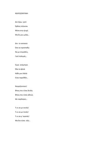 ΝΕΚΡΟΖΩΝΤΑΝΗ<br />Δεν ξέρω γιατί<br />Όρθιος στέκεσαι <br />Μέσα στην ψυχή<br />Μα δε μου μιλάς…<br />Δεν το κατανοώ<br />Όσο αν προσπαθώ <br />Να με στερηθείς,<br />Γιατί πολεμάς…<br />Είμαι ανήμπορη<br />Όλα τα φιλιά<br />Κάθε μου λαλιά<br />Είναι παρελθόν…<br />Νεκροζώντανη! <br />Φταις που είσαι δειλός<br />Φταις που είσαι αλλιώς<br />Με παγίδεψες…<br />Τι κι αν με κοιτάς!<br />Τι κι αν με πονάς!<br />Τι κι αν μ’ αγαπάς!<br />Μα δεν είσαι εδώ…<br />Μάταια η καρδιά<br />Μάταιο το κορμί<br />Μάταια η αγκαλιά,<br />Που μου γύρεψες…<br />Με τι αθωότητα<br />Σου ‘δωσα ψυχή,<br />Σου ‘δωσα τροφή <br />Και την κούρσεψες!<br />Δεν το μετανοώ <br />Μες σε μνήμα ζω<br />Λιώνω να σε δω<br />Για ν’ αναστηθώ<br />Αναμένω εδώ<br />Και σε νοσταλγώ<br />Λόγος που πονώ;<br />ΞΕΡΩ τι ποθώ…<br />