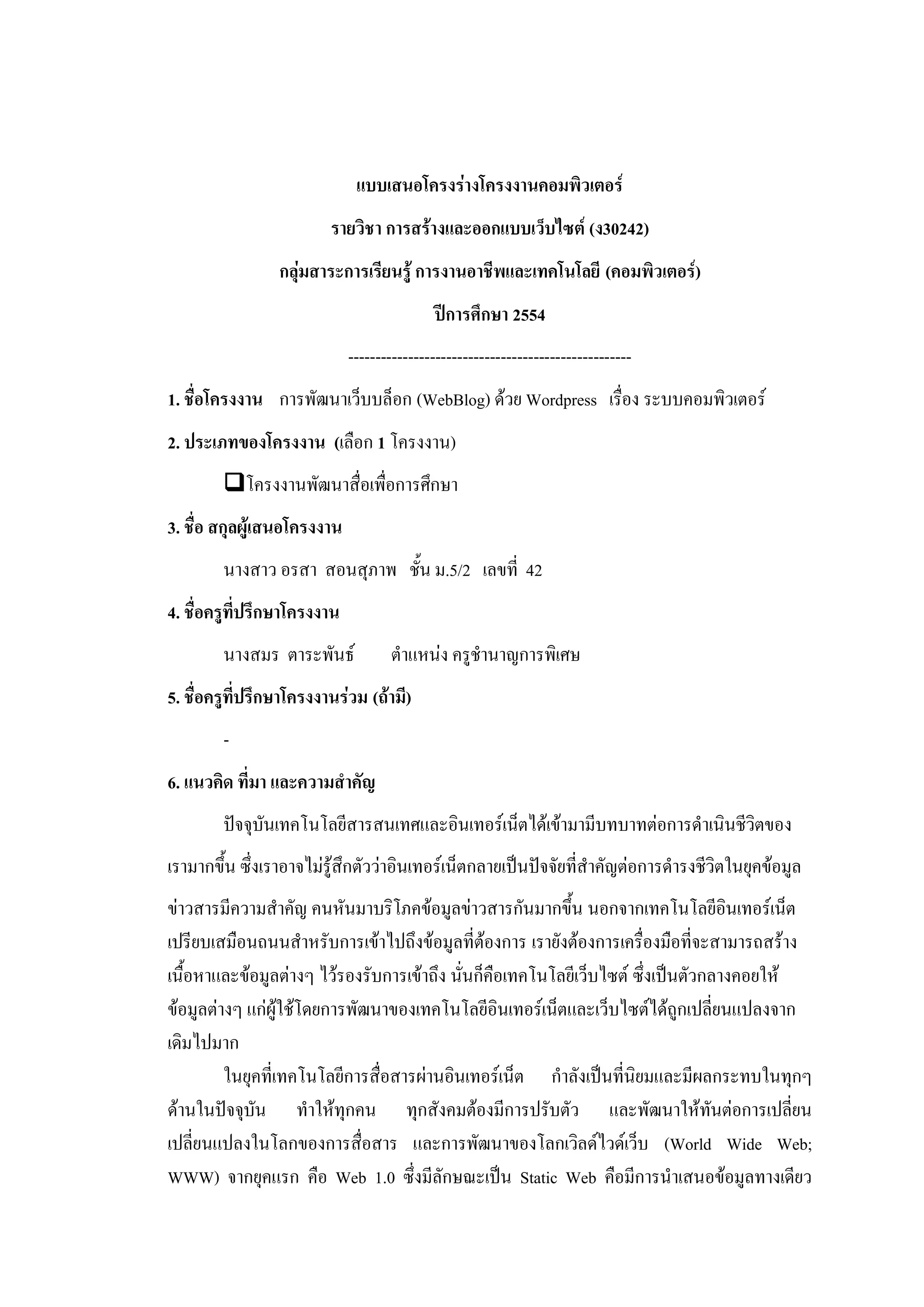 รายวิชา การสร้างและออกแบบเว็บไซต์ (ง30242) กลุ่มสาระการเรียนรู้ การงานอาชีพและเทคโนโลยี (คอมพิวเตอร์) ปีการศึกษา 2554 ---------------------------------------------------- 1. ชื่อโครงงาน การพัฒนาเว็บบล็อก (WebBlog) ด้วย Wordpress เรื่อง ระบบคอมพิวเตอร์ 2. ประเภทของโครงงาน (เลือก 1 โครงงาน) โครงงานพัฒนาสื่อเพื่อการศึกษา 3. ชื่อ สกุลผู้เสนอโครงงาน นางสาว อรสา สอนสุภาพ ชั้น ม.5/2 เลขที่ 42 4. ชื่อครูที่ปรึกษาโครงงาน นางสมร ตาระพันธ์ ตาแหน่ง ครูชานาญการพิเศษ 5. ชื่อครูที่ปรึกษาโครงงานร่วม (ถ้ามี) - 6. แนวคิด ที่มา และความสาคัญ ปัจจุบันเทคโนโลยีสารสนเทศและอินเทอร์เน็ตได้เข้ามามีบทบาทต่อการดาเนินชีวิตของ เรามากขึ้น ซึ่งเราอาจไม่รู้สึกตัวว่าอินเทอร์เน็ตกลายเป็นปัจจัยที่สาคัญต่อการดารงชีวิตในยุคข้อมูล ข่าวสารมีความสาคัญ คนหันมาบริโภคข้อมูลข่าวสารกันมากขึ้น นอกจากเทคโนโลยีอินเทอร์เน็ต เปรียบเสมือนถนนสาหรับการเข้าไปถึงข้อมูลที่ต้องการ เรายังต้องการเครื่องมือที่จะสามารถสร้าง เนื้อหาและข้อมูลต่างๆ ไว้รองรับการเข้าถึง นั่นก็คือเทคโนโลยีเว็บไซต์ ซึ่งเป็นตัวกลางคอยให้ ข้อมูลต่างๆ แก่ผู้ใช้โดยการพัฒนาของเทคโนโลยีอินเทอร์เน็ตและเว็บไซต์ได้ถูกเปลี่ยนแปลงจาก เดิมไปมาก ในยุคที่เทคโนโลยีการสื่อสารผ่านอินเทอร์เน็ต กาลังเป็นที่นิยมและมีผลกระทบในทุกๆ ด้านในปัจจุบัน ทาให้ทุกคน ทุกสังคมต้องมีการปรับตัว และพัฒนาให้ทันต่อการเปลี่ยน เปลี่ยนแปลงในโลกของการสื่อสาร และการพัฒนาของโลกเวิลด์ไวด์เว็บ (World Wide Web; WWW) จากยุคแรก คือ Web 1.0 ซึ่งมีลักษณะเป็น Static Web คือมีการนาเสนอข้อมูลทางเดียว