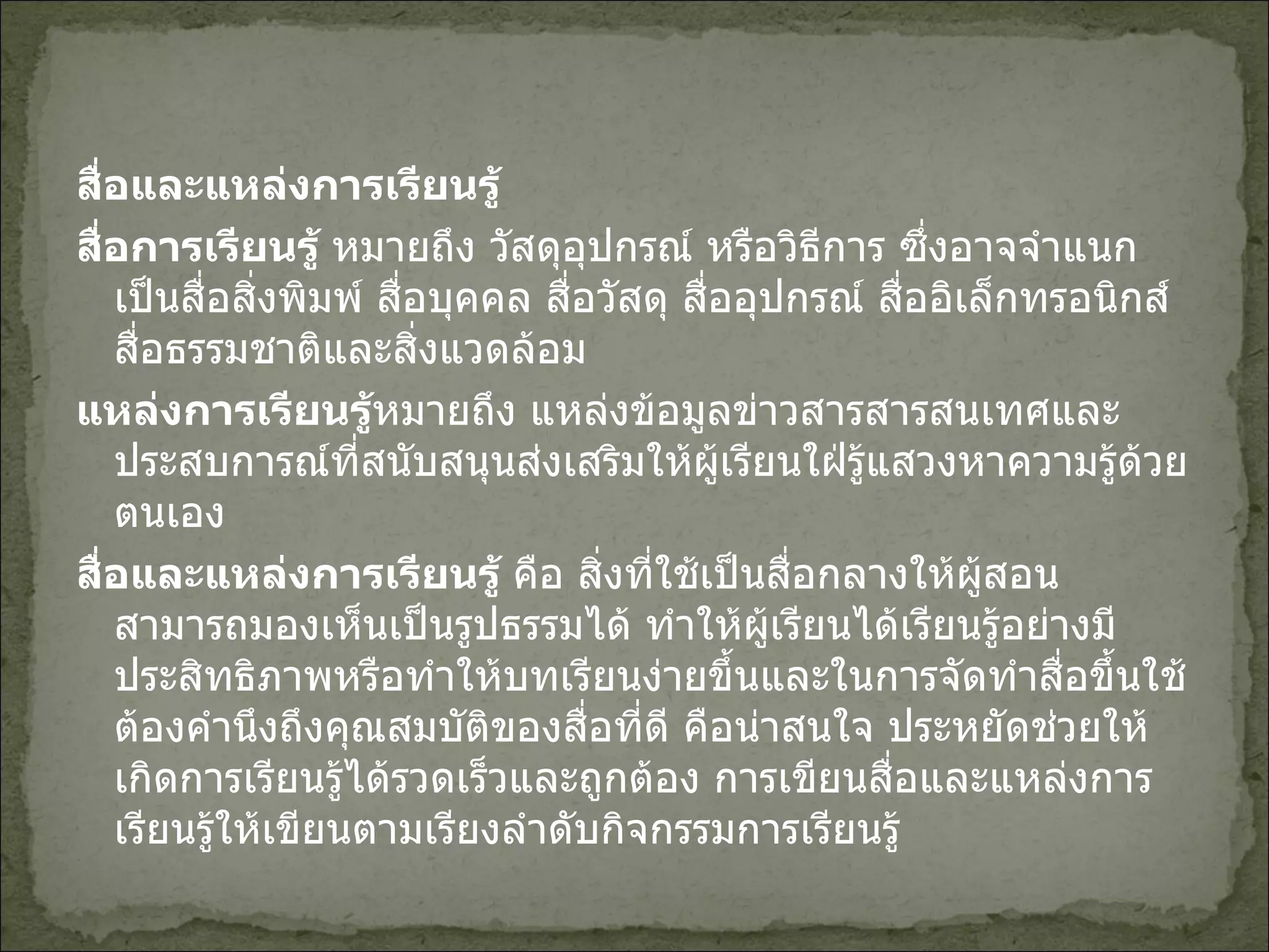 สื่อและแหล่งการเรียนรู้ สื่อการเรียนรู้ หมายถึง วัสดุอุปกรณ์ หรือวิธีการ ซึ่งอาจจำแนกเป็นสื่อสิ่งพิมพ์ สื่อบุคคล สื่อวัสดุ สื่ออุปกรณ์ สื่ออิเล็กทรอนิกส์ สื่อธรรมชาติและสิ่งแวดล้อม แหล่งการเรียนรู้ หมายถึง แหล่งข้อมูลข่าวสารสารสนเทศและประสบการณ์ที่สนับสนุนส่งเสริมให้ผู้เรียนใฝ่รู้แสวงหาความรู้ด้วยตนเอง สื่อและแหล่งการเรียนรู้ คือ สิ่งที่ใช้เป็นสื่อกลางให้ผู้สอนสามารถมองเห็นเป็นรูปธรรมได้ ทำให้ผู้เรียนได้เรียนรู้อย่างมีประสิทธิภาพหรือทำให้บทเรียนง่ายขึ้นและในการจัดทำสื่อขึ้นใช้ต้องคำนึงถึงคุณสมบัติของสื่อที่ดี คือน่าสนใจ ประหยัดช่วยให้เกิดการเรียนรู้ได้รวดเร็วและถูกต้อง การเขียนสื่อและแหล่งการเรียนรู้ให้เขียนตามเรียงลำดับกิจกรรมการเรียนรู้ - 3.