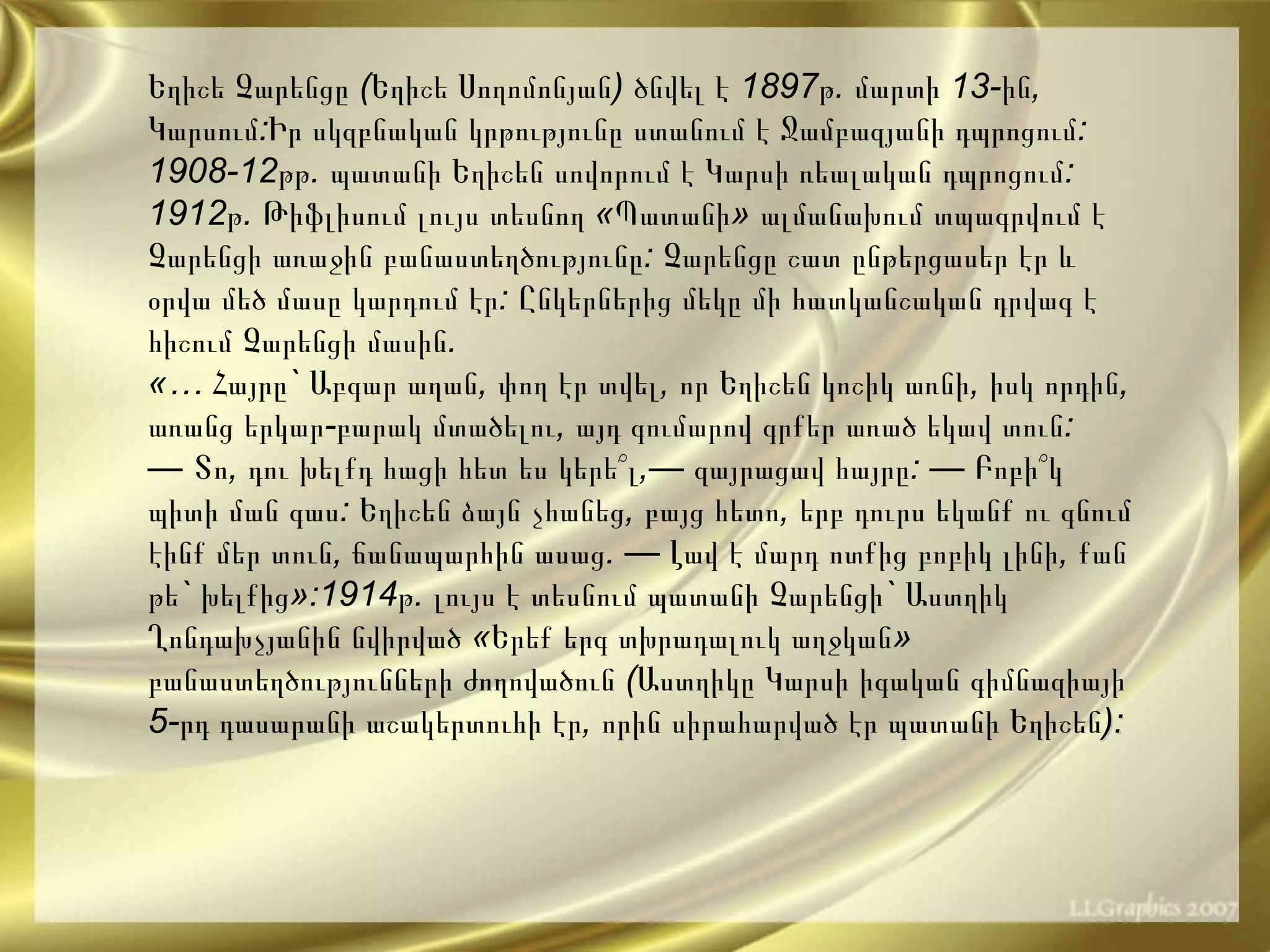 Եղիշե Չարենցը ( Եղիշե Սողոմոնյան ) ծնվել է 1897 թ . մարտի 13- ին , Կարսում :Ի ր սկզբնական կրթությունը ստանում է Ջամբազյանի դպրոցում : 1908-12 թթ . պատանի Եղիշեն սովորում է Կարսի ռեալական դպրոցում : 1912 թ . Թիֆլիս ում լույս տեսնող « Պատանի » ալմանախում տպագրվում է Չարենցի առաջին բանաստեղծությունը : Չարենցը շատ ընթերցասեր էր և օրվա մեծ մասը կարդում էր : Ընկերներից մեկը մի հատկանշական դրվագ է հիշում Չարենցի մասին . «… Հայրը ` Աբգար աղան , փող էր տվել , որ Եղիշեն կոշիկ առնի , իսկ որդին , առանց երկար - բարակ մտածելու , այդ գումարով գրքեր առած եկավ տուն : — Տո , դու խելքդ հացի հետ ես կերե՞լ ,— զայրացավ հայրը : — Բոբի՞կ պիտի ման գաս : Եղիշեն ձայն չհանեց , բայց հետո , երբ դուրս եկանք ու գնում էինք մեր տուն , ճանապա ր հին ասաց . — Լավ է մարդ ոտքից բոբիկ լինի , քան թե ` խելքից »:1914 թ . լույս է տեսնում պատանի Չարենցի ` Աստղիկ Ղոնդախչյանին նվիրված « Երեք երգ տխրադալուկ աղջկան » բանաստեղծությունների ժողովածուն ( Աստղիկը Կարսի իգական գիմնազիայի 5- րդ դասարանի աշակերտուհի էր , որին սիրահարված էր պատանի Եղիշեն ):