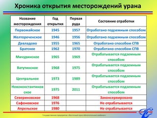 Документ описывает 60-летнюю историю и развитие уранового производства государственного предприятия «восточный горно-обогатительный комбинат», включая открытия месторождений, технологии добычи и переработки урановой руды. Рассматриваются производственные мощности, использование альтернативных технологий и планы модернизации для увеличения эффективности, снижения затрат и экологической нагрузки. В заключение подчеркивается важность внедрения современных технологий и переоснащения для повышения конкурентоспособности комбината.