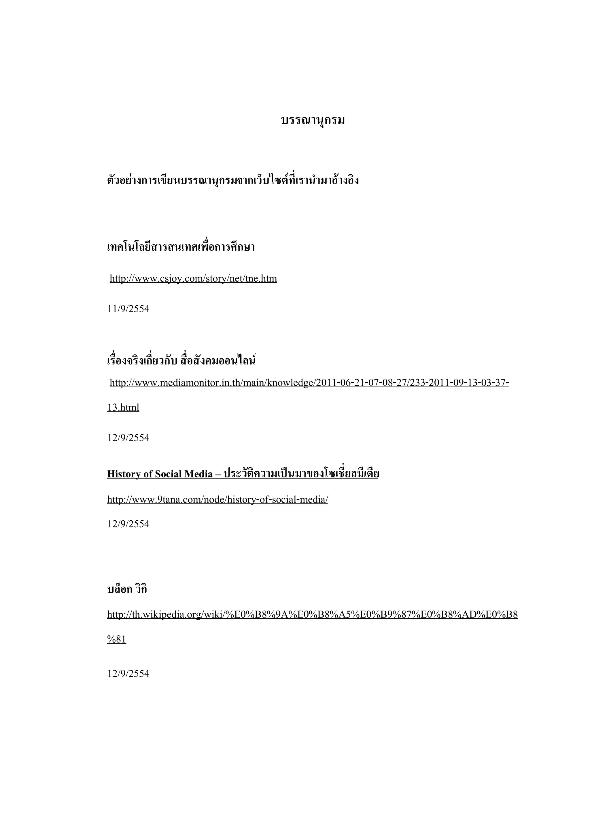 บรรณานุกรม ตัวอยางการเขียนบรรณานุกรมจากเว็บไซตที่เรานํามาอางอิง เทคโนโลยีสารสนเทศเพื่อการศึกษา http://www.csjoy.com/story/net/tne.htm 11/9/2554 เรื่องจริงเกี่ยวกับ สื่อสังคมออนไลน http://www.mediamonitor.in.th/main/knowledge/2011-06-21-07-08-27/233-2011-09-13-03-37- 13.html 12/9/2554 History