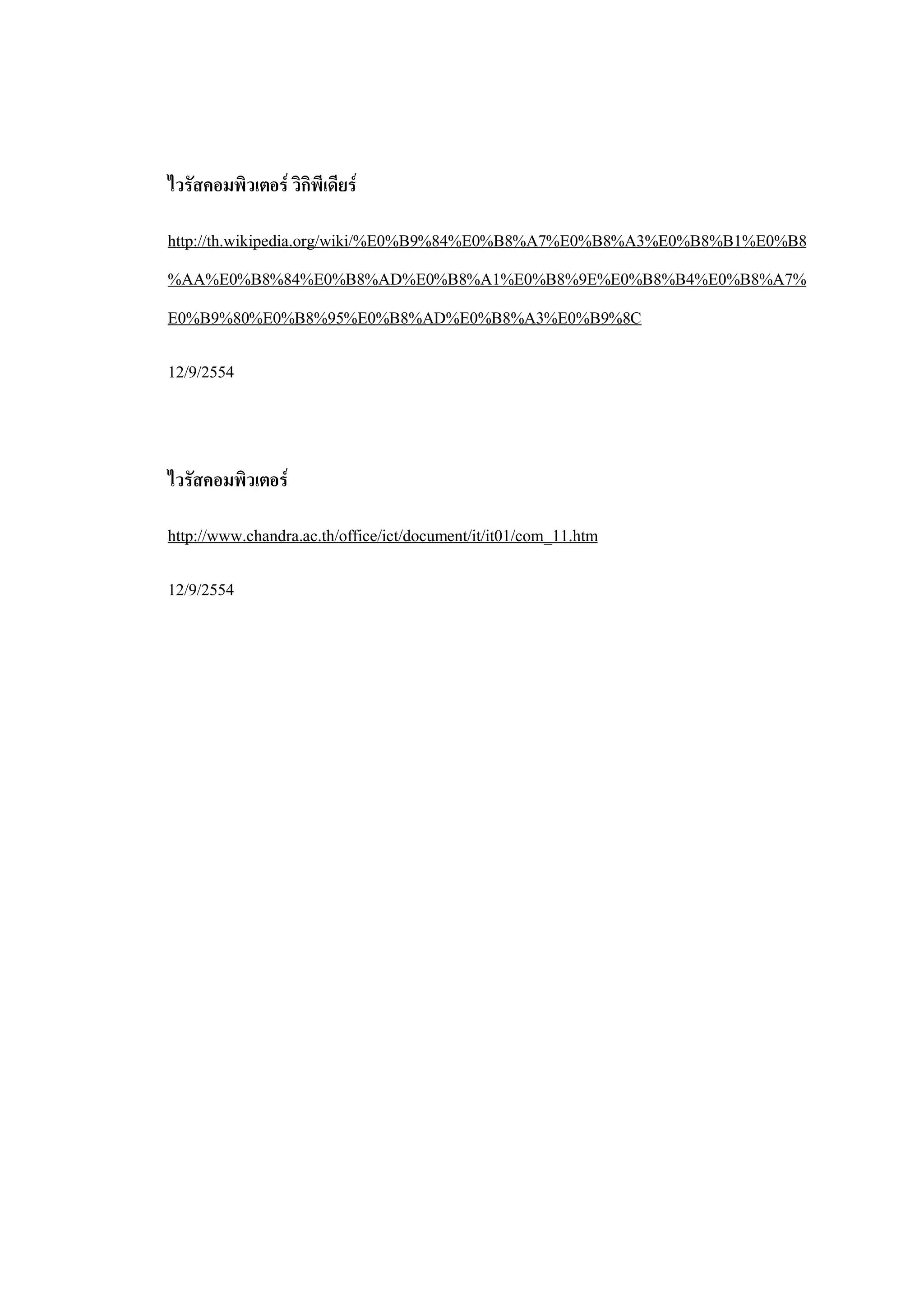 ไวรัสคอมพิวเตอร วิกิพีเดียร http://th.wikipedia.org/wiki/%E0%B9%84%E0%B8%A7%E0%B8%A3%E0%B8%B1%E0%B8 %AA%E0%B8%84%E0%B8%AD%E0%B8%A1%E0%B8%9E%E0%B8%B4%E0%B8%A7% E0%B9%80%E0%B8%95%E0%B8%AD%E0%B8%A3%E0%B9%8C 12/9/2554 ไวรัสคอมพิวเตอร http://www.chandra.ac.th/office/ict/document/it/it01/com_11.htm 12/9/2554